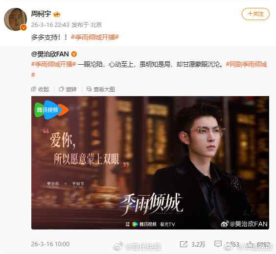 #周柯宇为樊治欣新剧打call# 3月16日,发文宣传新剧#网剧季雨倾城# 开播: 一眼沦陷,心动至上,虽明知是局,却甘愿蒙眼沉沦。转发支持,为新剧打call。(现代快报)更多消息:#邓凯演技##九成美直播指控田栩宁##邓凯跑了8年龙套##九成美不知道孩子是谁的##白鹿三天瘦了三斤#(编辑:杨雨桐;审签:谢杨柳)