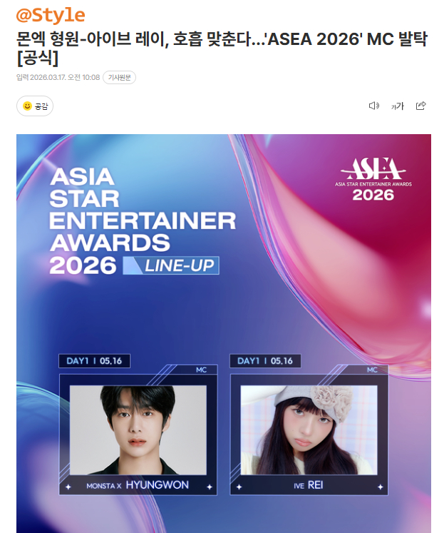 让代表亚洲的顶级艺人们齐聚一堂的《ASEA 2026》将于5月16日和17日在日本举行。其中,MONSTA X蔡亨源、IVE REI将担任5月16日的MC,一同合作。