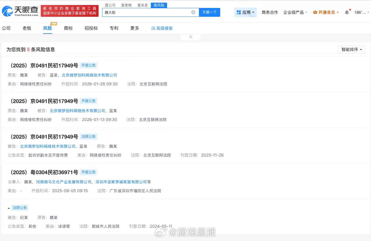 【#魏大勋曾多次告黑#,#侵权魏大勋黑粉道歉#】#魏大勋起诉黑粉侵权#据悉,3月16日,魏大勋委托律师事务所启动名誉维权诉讼程序。记者查询天眼查法律诉讼信息发现,此前,魏大勋已多次发起网络侵权责任纠纷等维权案件,被告涉及多个自然人及公司。其中,魏大勋与蓝某相关网络侵权责任纠纷案件曾定于2026年1月28日开庭审理。此外,纪某曾因严重侵犯魏大勋名誉权、肖像权向其公开道歉。魏大勋