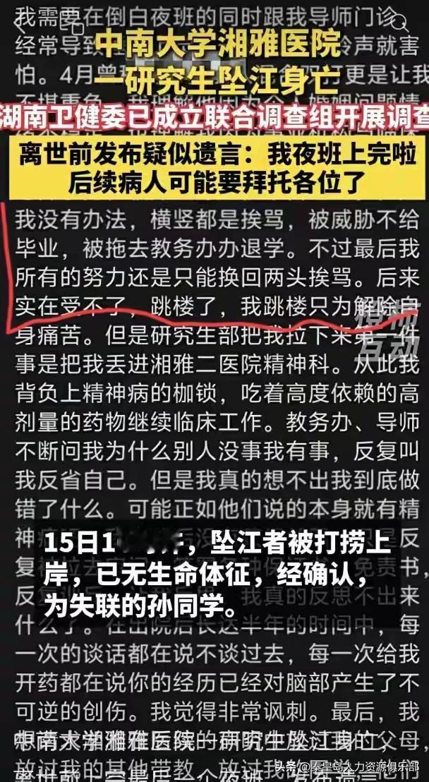太痛心了,刷到湘雅医院那个孙同学的事儿,心里堵得慌。一个二十五岁的姑娘,保研的医学生,眼瞅着就要毕业穿白大褂正式上岗了,人却没了。 看她的笔记,工整得像印刷出来的,能想象是个多认真、多热爱这行的好苗子。可结果呢?倒在了毕业前夕。 她导师,头衔能写一大串,留美归来,绝对是行业大牛。但就是这位“严师”,被学生描述成了一场噩梦。电话打到值班台当众骂,干不完的临床活,还要挤时间搞导师的课题…这哪是培养,这纯粹是压榨啊。 说白了,这就是职场里最让人憋屈的那种“坏领导”。只不过把办公室换成了医院和实验室。导师手握“生杀大权”——你能不能毕业,将来能不能留好医院,全凭他一句话。学生就成了最底层、最不敢吭声的“免费劳动力”,还是高学历的那种。 都说严师出高徒,但“严”和“坏”是两码事。脾气爆可能是性格,但把人当工具使,无尽地透支,这就是人品和权力滥用。这跟在公司里,碰上个只画饼、只甩锅、还掐着你晋升命门的上司,有啥区别?打工人还能偷偷摸摸找工作跳槽,研究生能往哪跳?导师不签字,几年青春直接白费。 核心问题就在这儿:当一个人对你的评价和去留拥有“绝对权力”,又缺乏有效的监督时,悲剧的种子就已经埋下了。这不仅在学术界,在太多职场环境里都一样。上面拼命要论文、要项目、要KPI,压力一层层传下来,最后全压在食物链最末端那个年轻人的肩上。 姑娘的父母该多心碎啊。养了二十多年,供出个硕士,没等到她救人,先被自己人给“吃”掉了。停诊、调查,这些后续动作,希望能真正撕开一条口子。不改变“老板一言堂”的评价体系,不打断这种畸形的权力链条,今天压垮的是学生,明天被压垮的,可能就是整个行业的未来。 这事,你怎么看?你们在职场或求学中,遇到过这种“绝对权力”的上司或导师吗?