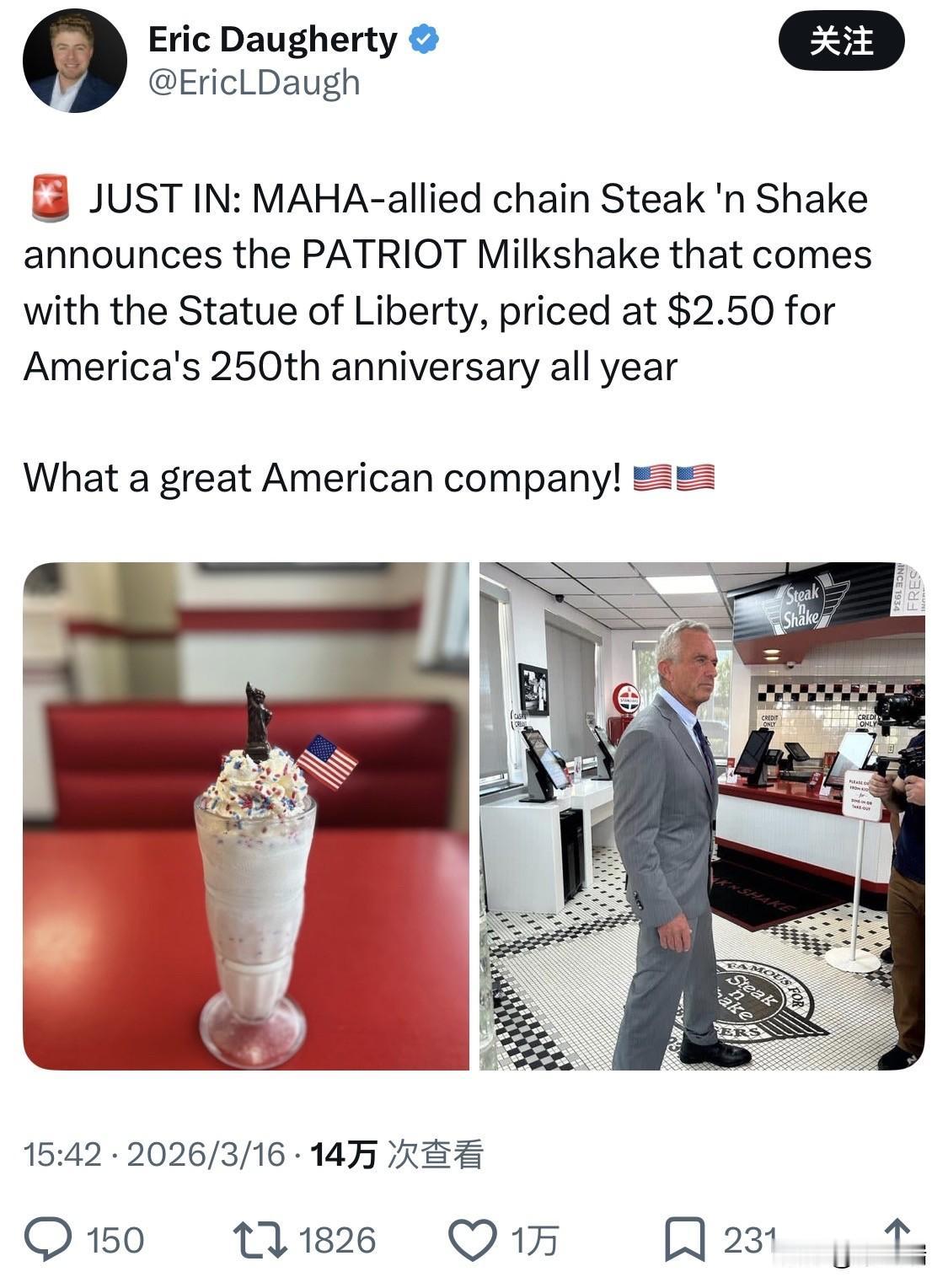 最新消息:MAHA联盟连锁餐厅Steak 'n Shake宣布推出“爱国者奶昔”,这款奶昔配有自由女神像,售价2.50美元,以此庆祝美国建国250周年,全年供应。 关于 MAHA 运动 MAHA 运动最初由罗伯特·F·肯尼迪(Robert F. Kennedy Jr.)发起,并在与特朗普政府合作后得到广泛推广。该运动的核心主张包括: 消除种子油:认为高度加工的植物油是现代健康问题的诱因之一。 减少加工食品:提倡回归传统的食品加工方式,减少化学添加剂的使用。 透明度:推动在菜单上添加更清晰的健康警告标签或成分说明。 美国连锁餐厅 Steak 'n Shake 是一家以“牛排堡”(Steakburgers)和“手摇奶昔”(Hand-dipped Milkshakes)闻名的经典美式快餐品牌。 品牌概况与历史 起源:1934 年由 Gus Belt 在伊利诺伊州诺默尔市(Normal, IL)创立,最初是从一家兼售炸鸡和啤酒的加油站转型而来。 核心理念:创始人为了证明肉质纯正,会当着顾客的面将 T 骨、西冷和圆牛肉磨碎成肉饼,因此诞生了著名口号 “In Sight, It Must Be Right”(眼见为实,必属精品)。 现状:总部位于印第安纳波利斯,目前是 Biglari Holdings 的全资子公司,在美国中西部、南部及欧洲和中东均有门店。