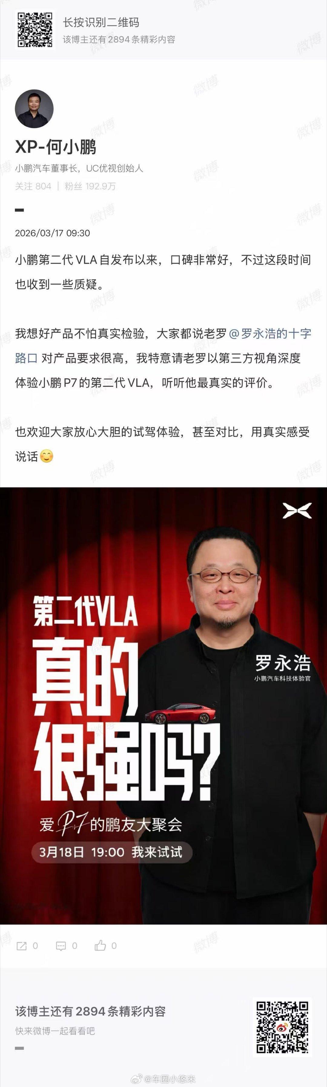 小鹏P7第二代VLA让老罗长了胆儿真金不怕火炼,好智驾不怕实测。小鹏第二代VLA收获好评,也坦然面对争议。何小鹏特邀产品严苛派罗永浩,第三方深度体验小鹏P7第二代VLA,只听真话,只看真表现。欢迎每一位用户大胆试驾、自由对比,真实体验,就是最好的答案。这次,小鹏也邀请P7用户到发布会分享对P7的喜欢原因与体验感受,3月18日19:00见。