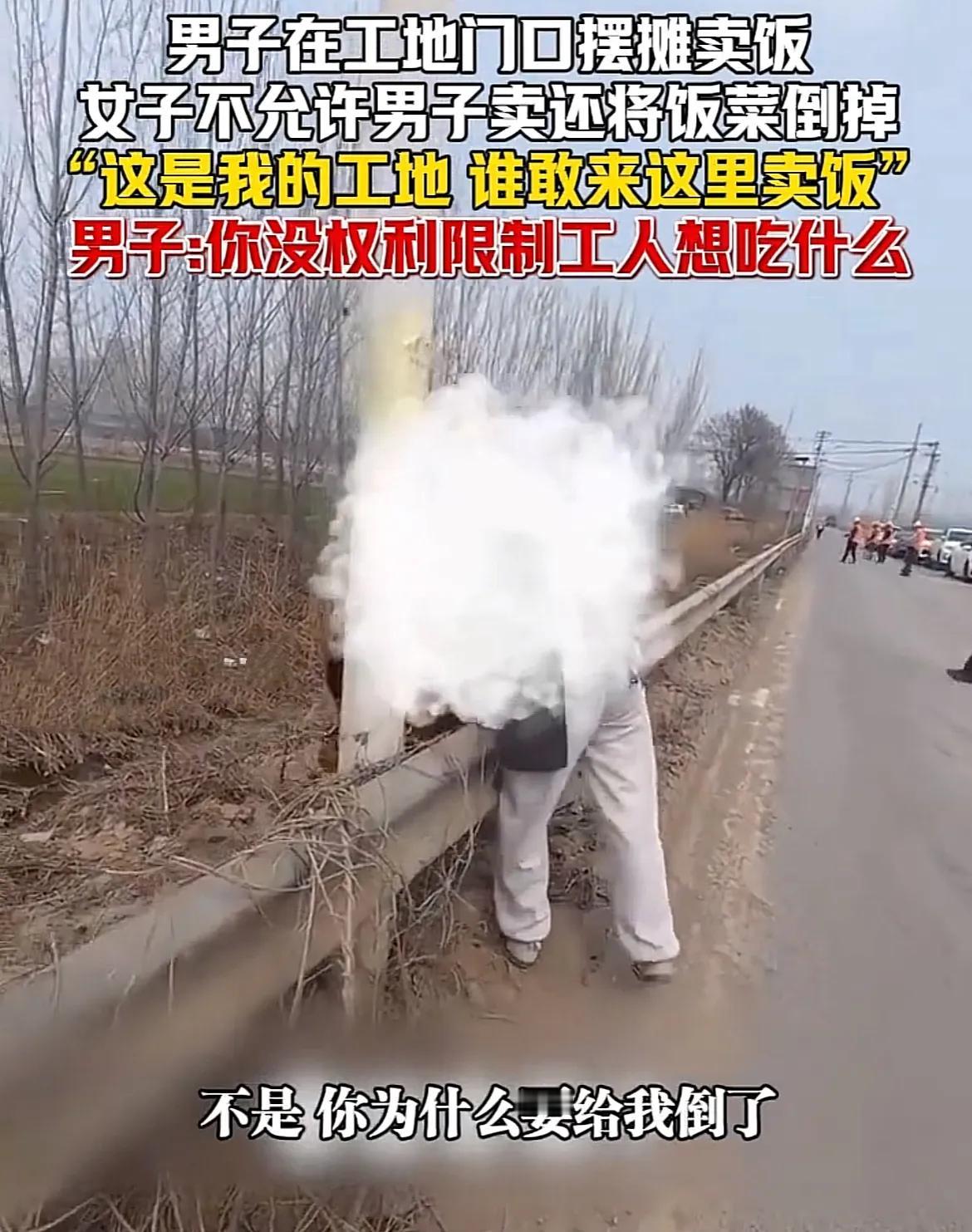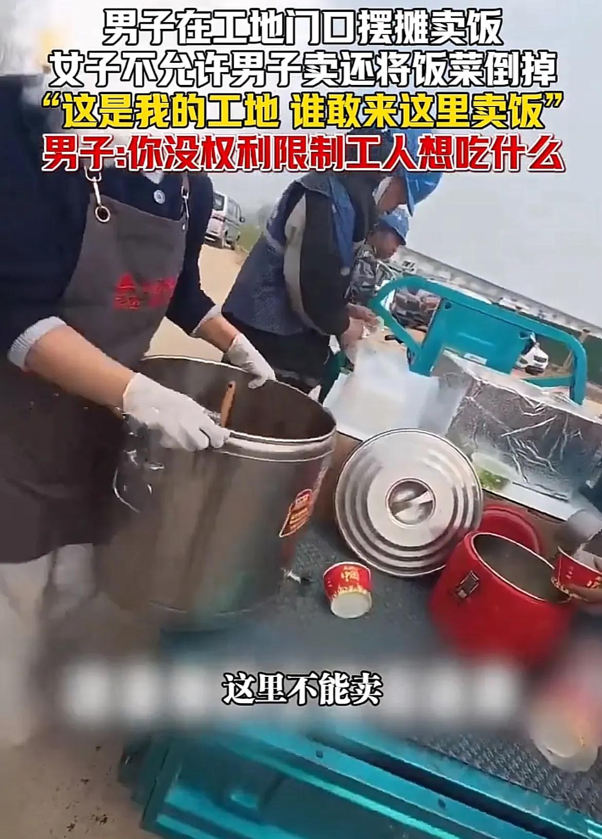 我规定的,不能卖!近日,山东济南出了个“倒饭姐”,张口闭口“我的地盘我做主”,不但口吐狂言,还动手把人家的一桶红烧肉倒掉! 从画面看,这是一个远离市区的工地,小伙子用三轮车拉着饭菜叫卖,没想到刚卖出四份,就从工地里冲出一个大姐。 大姐上来就质问小伙 :谁让你在这里卖的?小伙一脸懵:不是随便都能卖吗?大姐直接上手搬菜桶,一边搬一边说:木法卖!这是我的工地,木法卖! 然后,大姐不顾小伙阻拦,搬起一桶红烧肉,就倒进了路边的草丛里。大姐把空桶送回小伙的三轮车,恶狠狠地警告道:这不是你能卖的地方,赶紧走! 这也太欺负人了!现场被发到网上,画面给“倒饭姐”打了码,网友纷纷表示,想看一下她的真容,长几只眼啊,怎么这么横! 据说,这姐们儿是在工地开食堂的,因为小伙在门口卖饭,影响到她的生意,所以才整了这么一出闹剧。 不管出于什么原因,你也不能倒人家的饭菜啊,后来,小伙子报了案,“倒饭姐”认了错,小伙开始主张赔偿,但是后来,双方家人一拉呱,居然是乡亲,小伙就表示无所谓了! 他这一无所谓,把网友气着了,你真好脾气,我们可不惯着,这不,次日,这个工地门口摆摊卖饭的摊位,一下子增加了好几个,不少网友“不蒸馒头挣口气”,不但五元管饱,还有人买来超意兴,免费送给工人们吃,就是要治一治这个霸道的“倒饭姐”! “倒饭姐” 估计肠子都悔青了,她倒掉的不是小伙的饭,而是自己的生意。