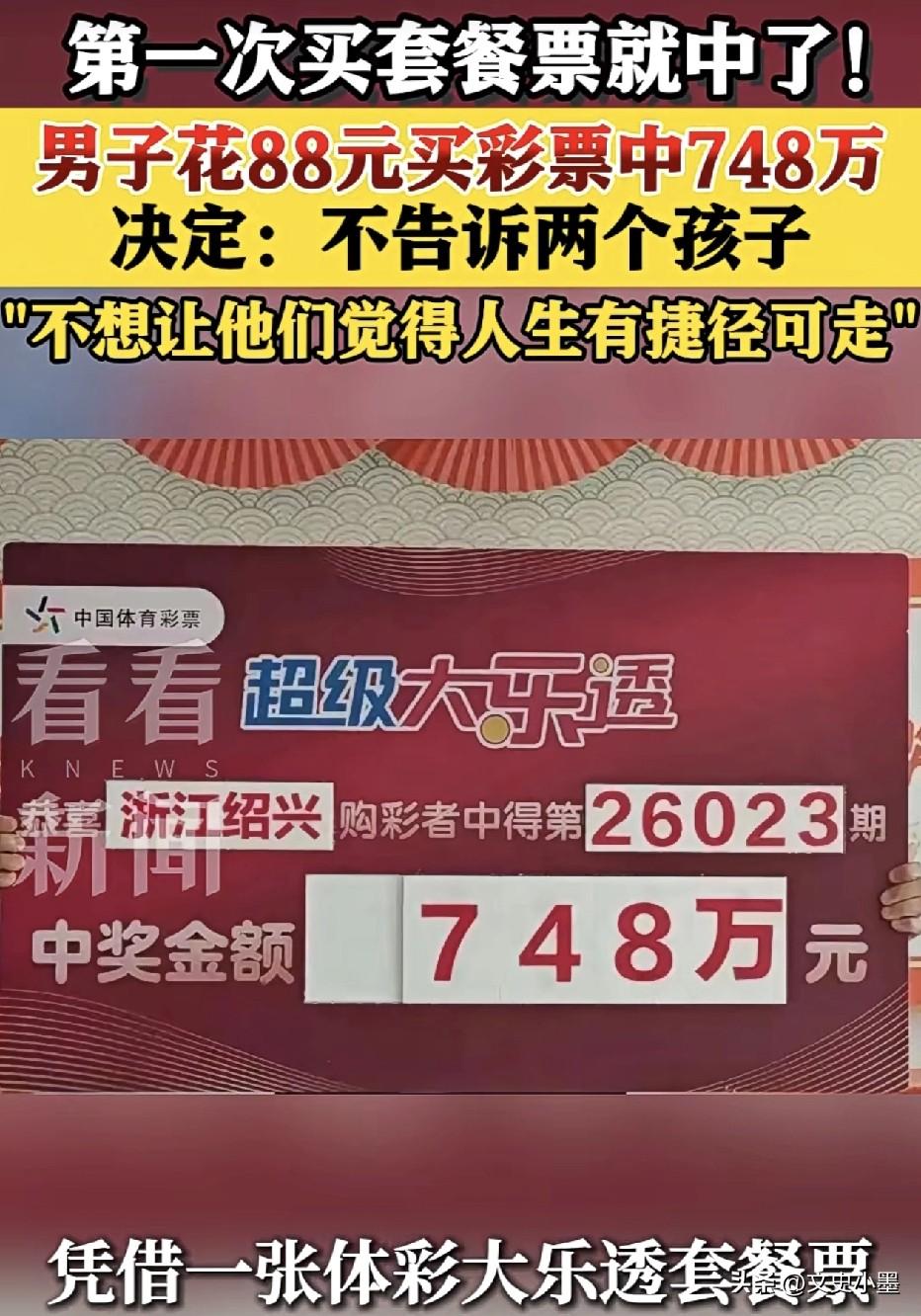 花88元中748万大奖后,男子的做法让人称赞! 近日,浙江一男子第一次花88元买套餐彩票,便中了748万元大奖,中奖后他选择悄悄把这份喜悦藏在心底,不告诉自己的两个孩子,因为他觉得自己的孩子正处于价值观形成的关键时期,不能让孩子们觉得人生可以通过中大奖走捷径,要通过自己努力去得到自己想要的生活! 非常赞同这位父亲的做法,买超级大乐透套餐彩票能中大奖的概率非常低,其中一等奖(5+2):概率为1/21,425,712(约0.0000047%),所以能中奖纯属运气爆棚! 这位父亲不告诉自己的孩子,不打破他们平静的生活状态和学习状态,让他们安心读书学习,该怎么努力还是怎么努力,其做法是对的!男子已经规划好这笔意外之财用途了,一是用来改善现在家庭生活条件,二是计划一下孩子未来的生活教育投入!将钱花在刀刃上,不浪费一分! 现实中有的人不要说中几百万大奖了,就算中个万八千的奖也恨不得人尽皆知,要记住财不外露这句古语,低调做人!