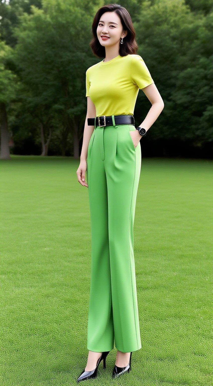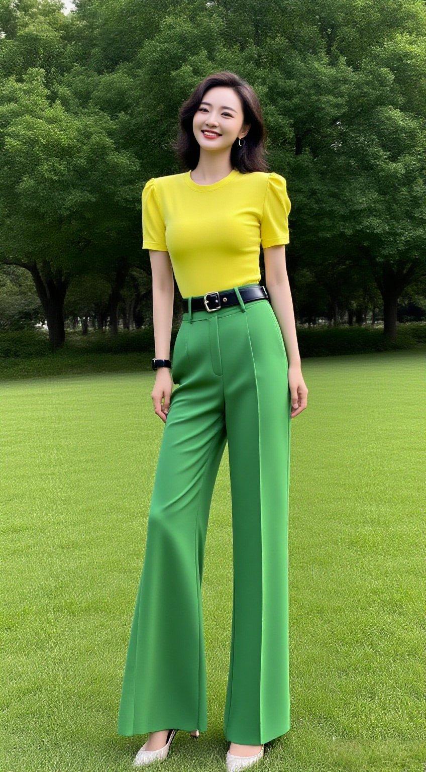 绿衣美人倚绿树,笑语盈盈意自闲。