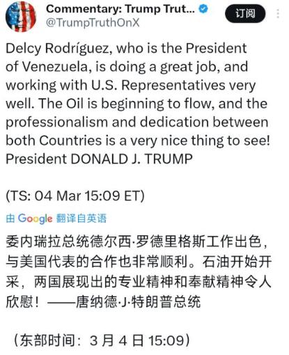 特朗普评委内瑞拉代总统德尔西·罗德里格斯:“这位总统干得相当不错。我跟他相处得非常好。” 特朗普之所以满意,最核心的一点,就是罗德里格斯乖乖把委内瑞拉的石油收入,全部打入了美国指定的固定账户。大家都知道,石油是委内瑞拉的命脉,这个国家的已探明石油储量在全球都排得上号,石油出口是国家最主要的收入来源。 可罗德里格斯上台后,直接让美国接管了委内瑞拉的石油出口,不管是美国企业开采委内瑞拉的石油,还是委内瑞拉自己出售石油,所得的所有款项,都必须存入美国财政部管理的账户里。 更关键的是,美国还规定,所有和委内瑞拉石油相关的合同,都必须遵守美国的法律,就连石油运输都得由美国指定的公司负责。 有数据显示,2026年1月,美国通过出售委内瑞拉石油赚了5亿美元,2月份就翻了一倍,涨到了10亿美元,而美国还计划再出售价值50亿美元的委内瑞拉石油。 可这些钱,委内瑞拉几乎分不到多少,大部分都被美国截留了,罗德里格斯对此不仅不反对,还全力配合,这让特朗普怎么能不满意? 除了石油,罗德里格斯还按照美国的意愿,断绝了委内瑞拉几十年来对古巴的原油供应,直接让古巴的经济和民生陷入了崩溃。 古巴是个小国,国土面积小、人口少,一直以来都被美国封锁,而委内瑞拉之前和古巴是好兄弟,常年给古巴供应低价原油,巅峰时期,古巴90%以上的石油都来自委内瑞拉,靠着这些石油,古巴才能维持国家运转、保障民生。 可罗德里格斯听了美国的话,从2026年1月开始,彻底切断了对古巴的所有石油供应。这一下,古巴彻底陷入了困境,没有石油,发电厂发不了电,全国频繁出现大规模停电,最多的时候有1000万人失去电力供应;公交车、卡车跑不了,城市交通几乎瘫痪,老百姓出门只能靠步行、骑自行车;农业机械动不了,工厂开不了工,就连老百姓做饭的燃气都供不上,医院的手术都得推迟,整个国家的经济和民生彻底垮了下来。 而这一切,都是罗德里格斯配合美国造成的,特朗普看在眼里,自然对她更加满意。 就在前不久,罗德里格斯又做了一件让特朗普开心的事,她按照美国的要求,把价值一亿美元的黄金,连夜运到了华盛顿。 这笔黄金大概有1吨重,是委内瑞拉国有矿业公司按照美国的规定,出售给国际交易商后,再运到美国进行精炼的。 而且美国还定了规矩,委内瑞拉以后所有的黄金,都得运到美国境内精炼,交易流程要遵守美国法律,出售黄金的款项,也得存入美国指定的账户。 其实,罗德里格斯之所以这么配合美国,也有她自己的无奈和私心。委内瑞拉现在的经济状况非常差,2025年的GDP只有828亿美元,可欠别的国家的外债却高达1500多亿美元,欠的钱比全年的收入还多一倍不止,而且国家的国际储备还被冻结了,不管是偿还外债,还是搞国内建设,都得看美国的脸色。另外,美国司法部还曾暗中筹备起诉罗德里格斯,涉嫌腐败和洗钱,这也是美国对她的一种施压。 罗德里格斯心里清楚,只有讨好美国,才能保住自己的代总统位置,才能让美国放松对委内瑞拉的制裁,哪怕是牺牲国家利益、牺牲古巴这个老朋友,她也在所不惜。她甚至还向美国承诺,会以“特朗普式的速度”推进矿产开放,尽快修改矿业法,让美国企业能更方便地开采委内瑞拉的黄金、钻石、稀土等资源。 美国内政部长曾说,过去两个月,美国和委内瑞拉取得的进展,比过去二十年还要多,这话其实就是在夸罗德里格斯配合得好。特朗普夸她“干得相当不错”,说白了,就是夸她听话、懂事,能按照美国的心意,把委内瑞拉的资源一步步交给美国掌控,能帮美国打压古巴,能让美国从中赚得盆满钵满。 大家看清楚就知道,特朗普的夸奖,从来都不是因为罗德里格斯有能力、为委内瑞拉人民谋福利,而是因为她牺牲了自己国家的主权和利益,成了美国掌控委内瑞拉的傀儡。 罗德里格斯看似坐稳了代总统的位置,实则是在出卖国家和人民的利益,而美国,不过是借着她的配合,大肆掠夺委内瑞拉的资源,实现自己在中南美洲的霸权野心。 这件事也让我们看明白,美国所谓的“友好”和“认可”,从来都不是无偿的,背后都是赤裸裸的利益交换。 只要你听话、配合,能让美国占到便宜,美国就会对你和颜悦色、多加称赞;可一旦你不服从,美国就会动用各种手段施压、制裁,甚至发动军事打击,这就是美国的霸权逻辑。而罗德里格斯的所作所为,不过是美国霸权下,一个牺牲国家利益换取个人权力的缩影罢了。