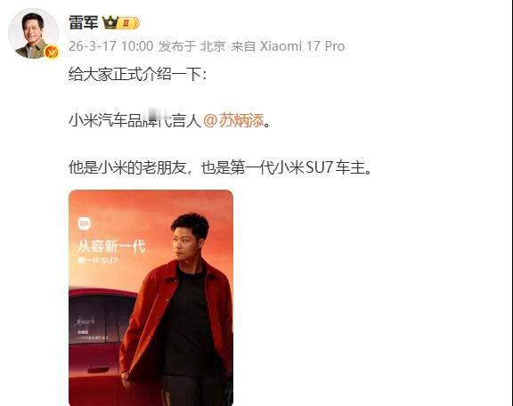 苏炳添官宣代言小米汽车苏炳添居然是小米汽车车主!谁懂啊!苏炳添直接代言小米汽车了而且是开了SU7 Max超一年的真实车主本人评价:操控稳、精准、值得信任新一代小米SU7 3.19正式上市预售22.99万起,全系涨1.4万动力、续航、智能全都升级亚洲飞人×小米汽车速度对决速度,这波真的顶