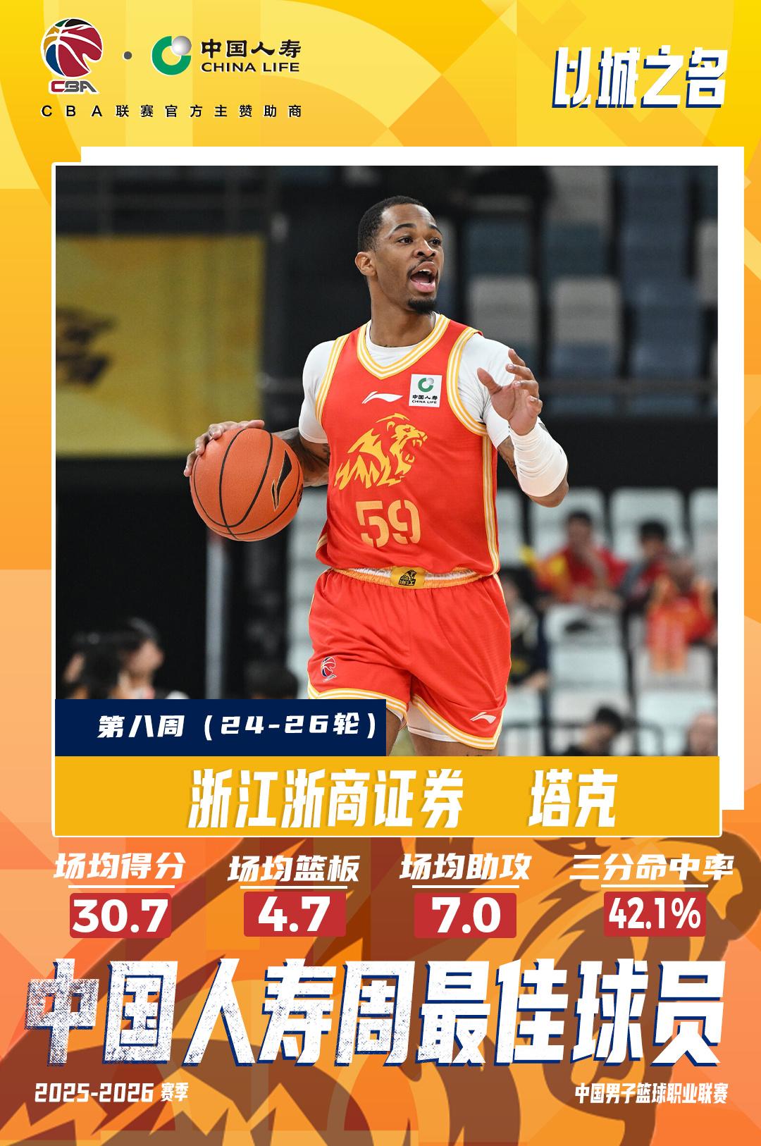 浙江浙商证券球员塔克本周出战3场,率队取得其中2场胜利,他场均出场32分钟,可以得到30.7分、4.7篮板、7助攻。