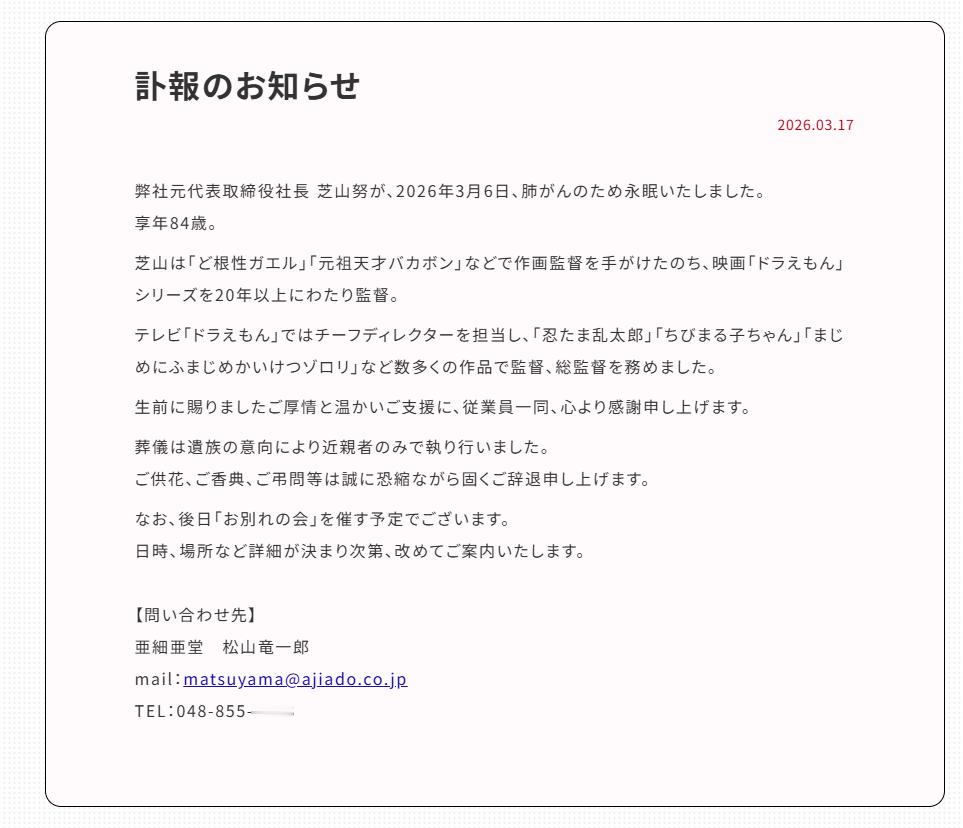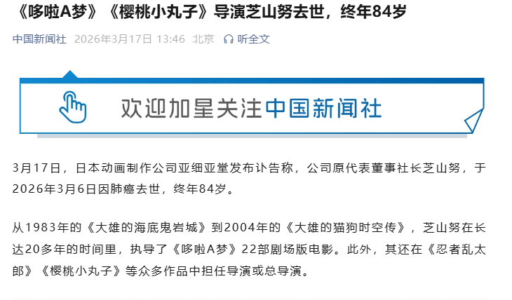 【哆啦A梦樱桃小丸子导演芝山努去世】 17日,日本动画制作公司亚细亚堂发布讣告称,公司原代表董事社长芝山努,于2026年3月6日因肺癌去世,终年84岁。从1983年的《大雄的海底鬼岩城》到2004年的《大雄的猫狗时空传》,芝山努在长达20多年的时间里,执导了《哆啦A梦》22部剧场版电影。此外,其还在《忍者乱太郎》《樱桃小丸子》等众多作品中担任导演或总导演。