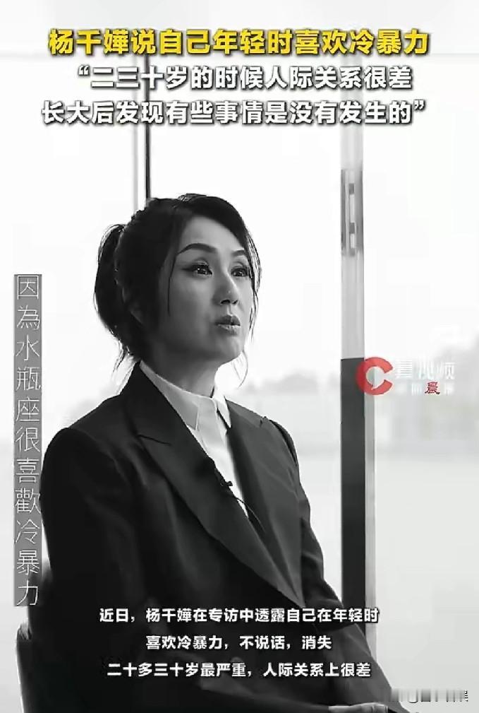 杨千嬅,太让人意外了! 3月17日,杨千嬅突然冲上了热搜,不是和老公秀恩爱,也不是官宣演唱会,而是她最新在专访中自曝年轻时的性格短板,一番掏心窝子的话,引起了网友们的讨论。 画面里的她穿着干练黑西装,白衬衫衬得气质沉稳,低马尾利落又大气,眼神里满是过来人的通透。 她坦言自己年轻时特别爱用冷暴力解决问题——不说话、玩消失,二三十岁时情况最严重,人际关系一塌糊涂。 她还笑着说起过去的内耗:“人家一句话、一个眼神,我就能在心里越想越黑,长大后才发现,很多事情根本没发生。” 最后她还分享了和解的心得:“如果你真心当那段缘分是真实,还有感情,你现在还愿意,那你就去找人,其实没有什么的,那一秒钟就没事了。” 看到这,有网友感慨:“原来像杨千嬅这样的明星,在二三十岁的时候也会这么内耗。” 也让有的网友很意外:“我一直以为杨千嬅是属于大大咧咧那种性格,事情过去了就算了,没想到她也有这么敏感内耗的一面。” 说起杨千嬅,那可是香港乐坛的“烈女”代表,从《可惜我是水瓶座》到《勇》,她的歌里藏着无数人的倔强与温柔。 印象里,杨千嬅就是那种敢爱敢恨的人,没想到私下里也曾是会陷入情绪内耗的普通人,还挺让人意外的。 如今52岁的她,过得很幸福,事业有成,老公宠爱,还有一个帅气的儿子,一家三口同框满是欢乐和幸福。