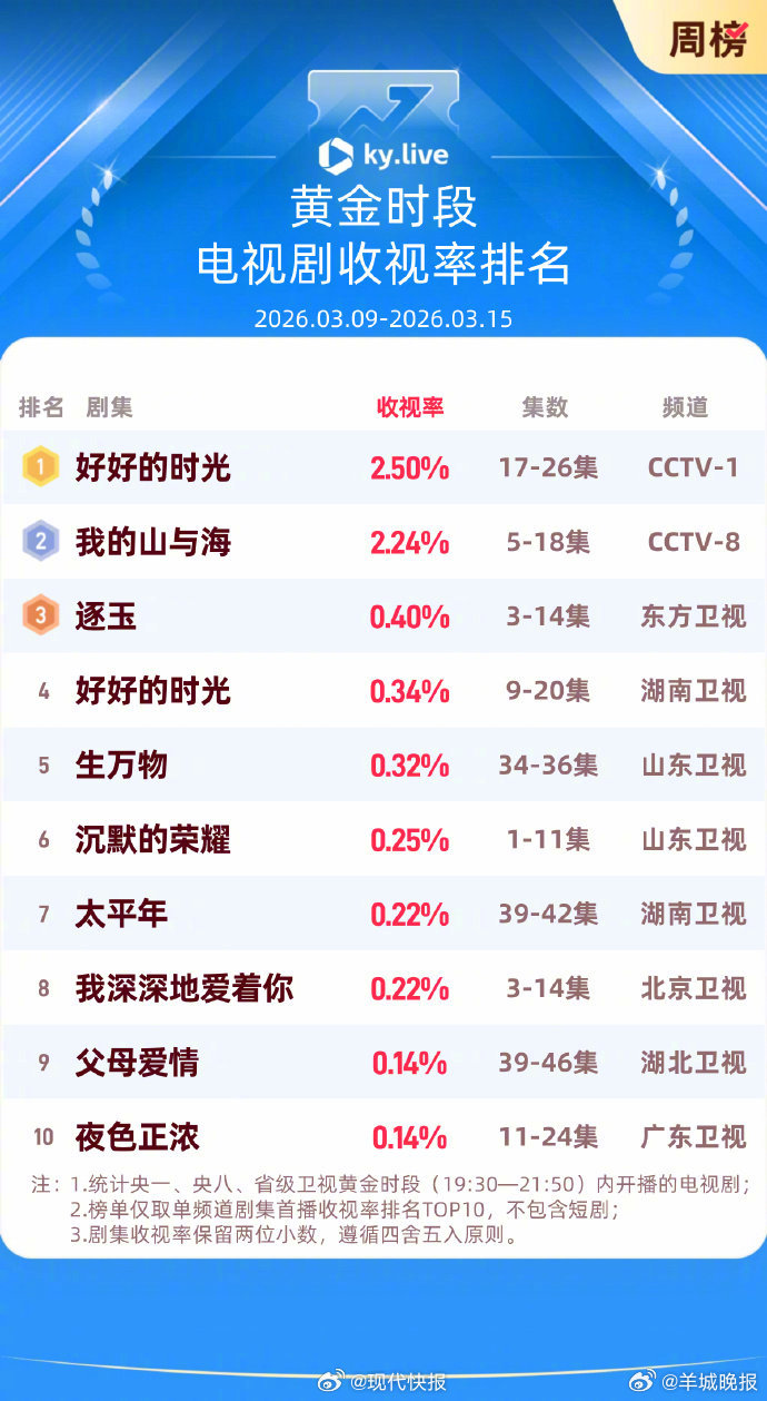 【#好好的时光收视蝉联周冠#】等主演的《好好的时光》自开播以来收视率、热度持续攀升,公布2026年第11周黄金时段电视剧收视率表现:《好好的时光》 央一收视率2.50%,蝉联周冠。公布0309-0315欢网大数据周榜,《好好的时光》 CCTV-1一周平均收视3.11%,成为央视首播剧收视TOP1;湖南卫视一周平均收视0.32%,成为当周收视TOP2。(现代快报)更多消息:#瞿颖已婚##刘大锤聊张凌赫田曦薇##豆包给周也指导的穿搭##小巷人家第二部##正午阳光又要拍宅斗了##田栩宁启动新一轮名誉维权程序##好好的时光多平台收视第一#(编辑:杨雨桐;审签:谢杨柳)