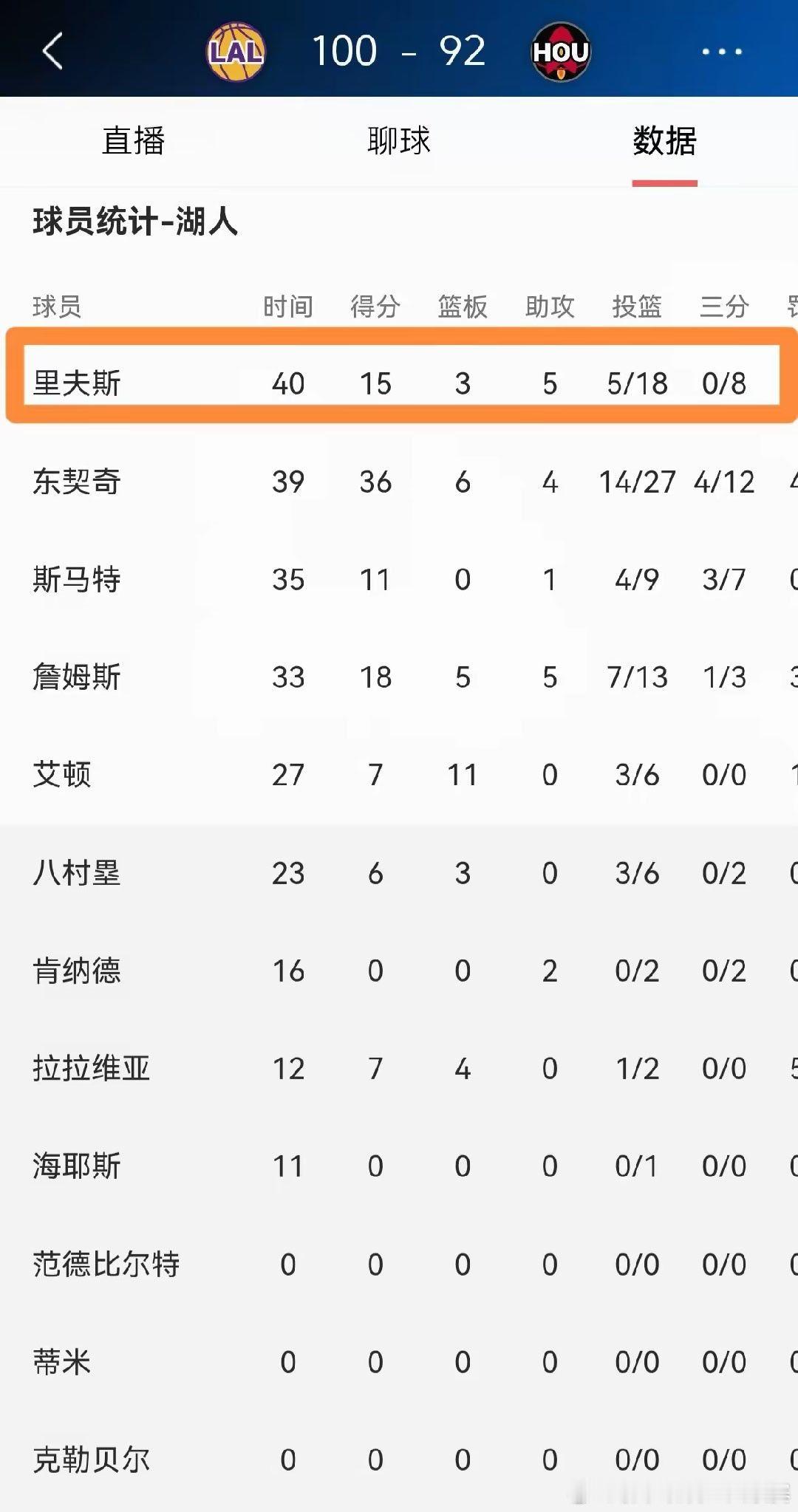全场比赛下来,里弗斯首发出战40分钟,投篮18中5,其中三分球8中0、罚球5中5极其低效的得到15分。