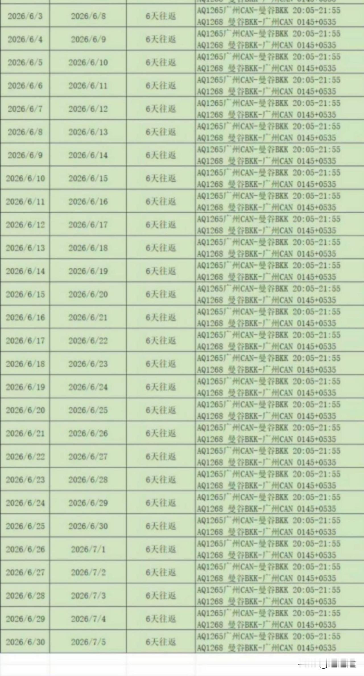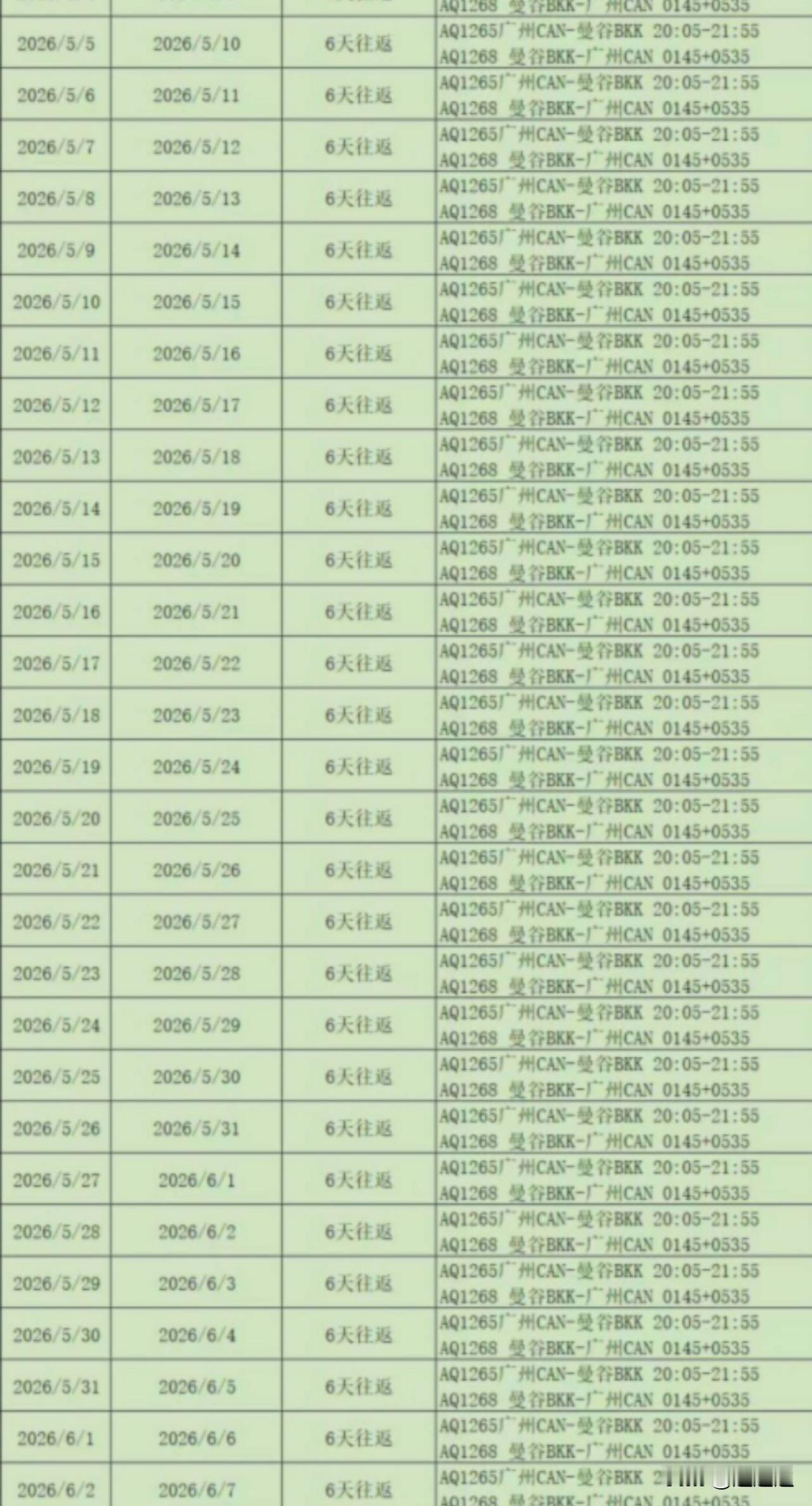 原本广州到曼谷很多特价机票999含税,天天有很多位置卖多好,由于油价的暴涨,一个星期只剩这些日期有位置了,而且价格也涨了,这种旅游团队机票,虽然比网上的特价机票便宜,但不一样,特价机票是不含免费行李的,搞托运就得上百块,这个旅游团队机位是有免费托运行李的