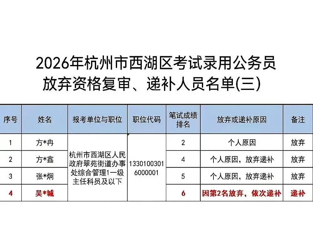 杭州西湖区一个公务员岗位,招1个人,结果第2、第4、第5名全跑了,硬是让笔试第6名给捡漏进了面试 。