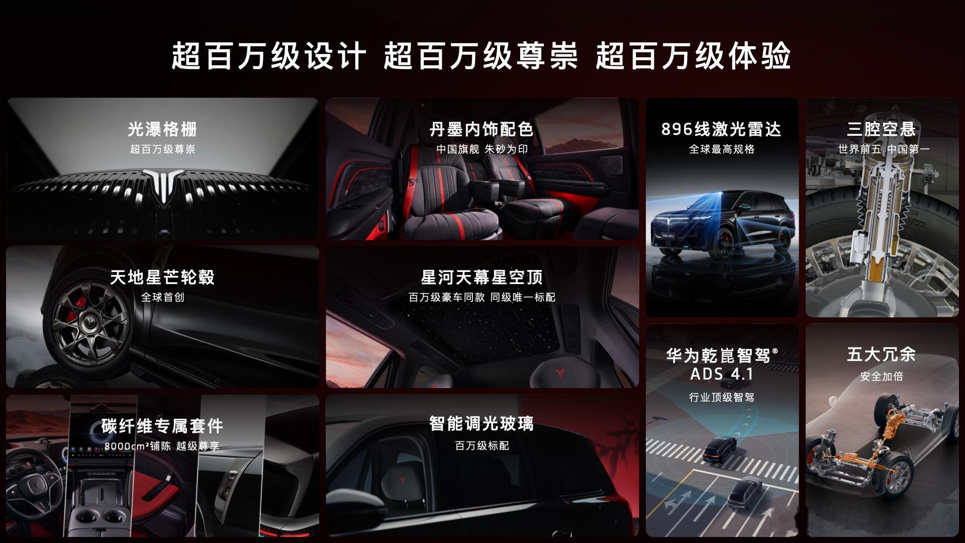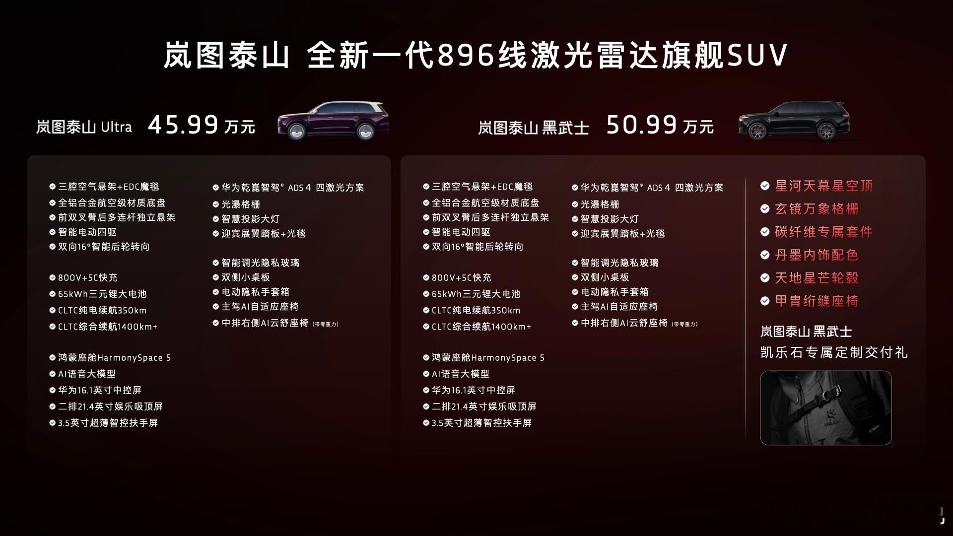 896线激光雷达全球首秀看岚图泰山 岚图汽车“全新⼀代896线激光雷达旗舰SUV”岚图泰山Ultra版及泰山黑武士版的正式上市了,全球首发 896 线双光路图像级激光雷达,搭配华为乾崑 ADS 4.1 智驾,感知能力进一步增强。同级唯一三腔空悬,同时还有智慧光语、奢享座舱、全域魔毯底盘、800V 智能超混等豪华配置,同时上市的岚图泰山黑武士版则在外观上进行了差异化的设计,采用专属玄墨车色、8000cm²碳纤维套件,PVD天地星芒轮毂,百万级同源的星河天幕星空顶以及丹墨红黑内饰与智能调光玻璃,带来不一样的尊崇体验。售价方面,岚图泰山Ultra45.99万元,岚图泰山黑武士版50.99万元。