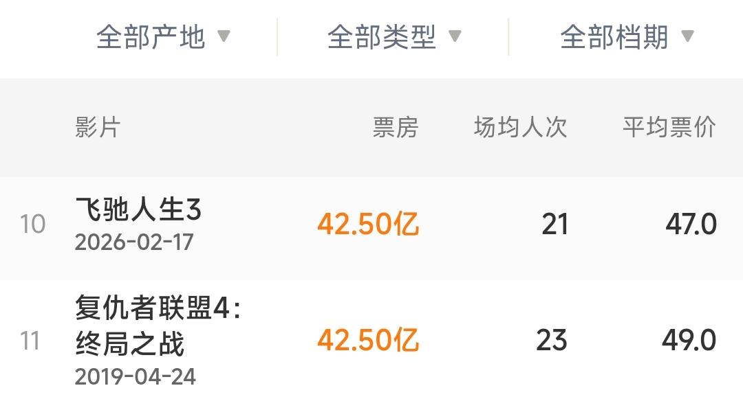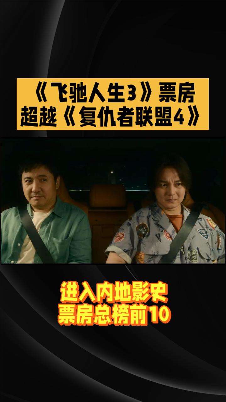 《飞驰人生3》票房超越《复联4》,进入内地影史前十。 由韩寒执导,沈腾、尹正、黄景瑜、张本煜领衔主演,魏翔、沙溢、范丞丞、孙艺洲主演,段奕宏特邀主演,张新成、胡先煦、李治廷、白宇帆、周政杰、高华阳特别出演,贾冰、王安宇、陈永胜、冯绍峰、郝瀚友情出演的喜剧电影《飞驰人生3》累计综合票房超过42.5亿,已超越《复仇者联盟4:终局之战》,成功进入内地影史票房总榜前10名。至此,内地票房榜前10名仅剩《疯狂动物城2》一部外国电影。 虽然《飞驰人生3》以绝对优势拿下2026春节档票房冠军,但也有人评价是“山中无老虎”,且大盘整体情况不容乐观,2026年度票房最终能否达到400亿都是个未知数。