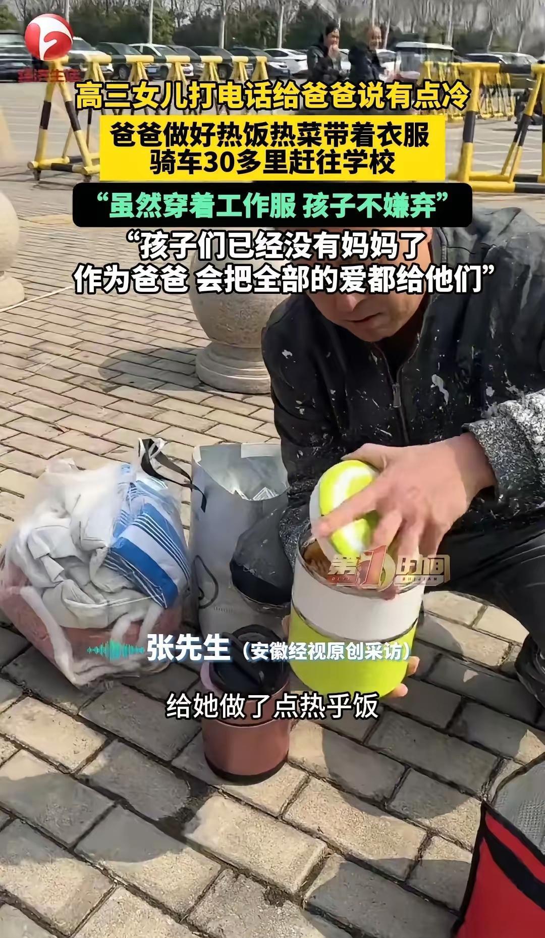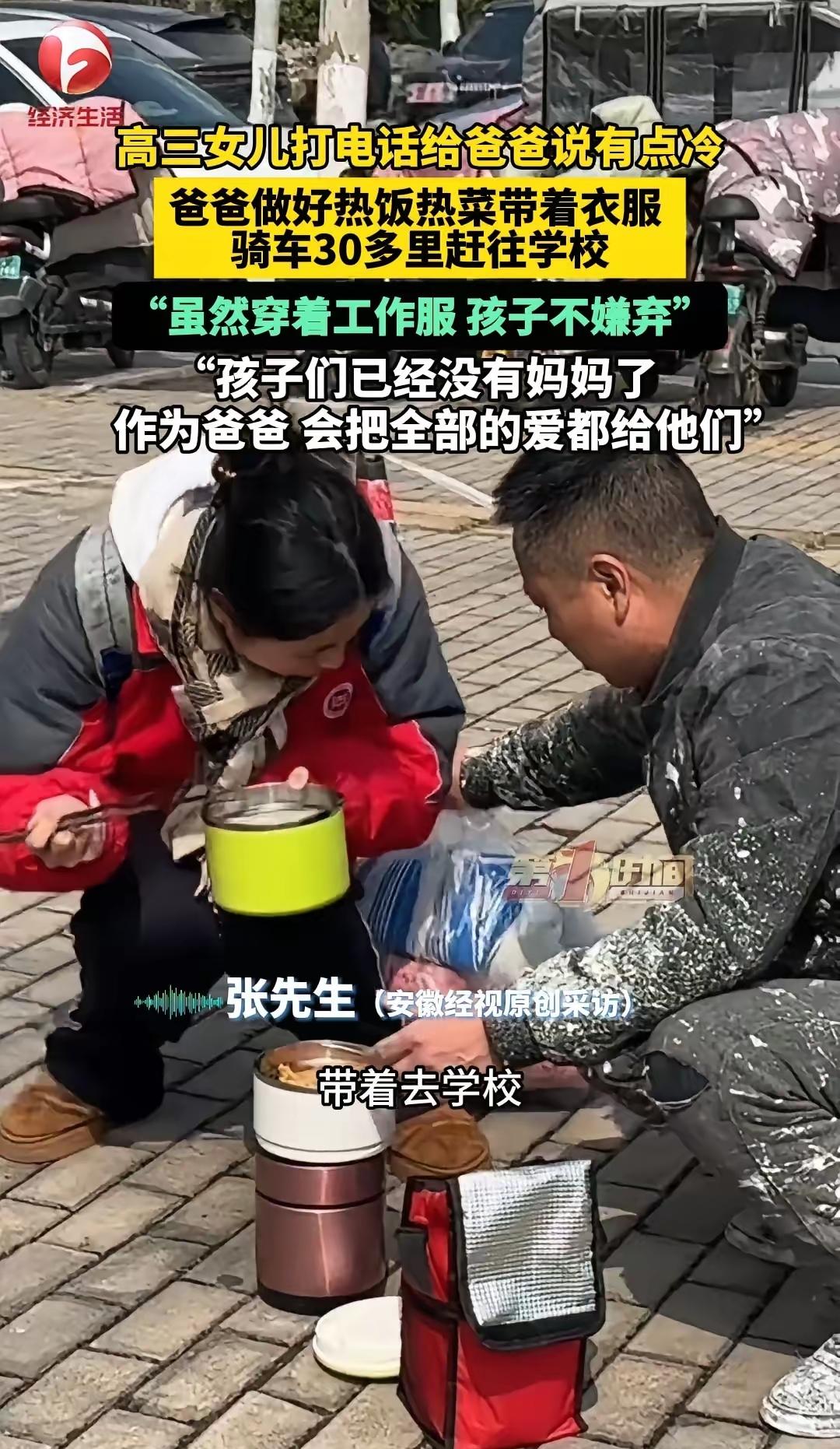 绷不住了!安徽一位高三女儿,晚自习前给爸爸打了个电话,轻轻说了一句:“爸,我有点冷。”就这一句话,单亲爸爸张先生瞬间坐不住了。 彼时的张先生正在工地做着零散的体力活,手上还沾着没擦干净的水泥灰,接到女儿电话的那一刻,所有的疲惫和辛苦都被抛到了脑后。他和女儿相依为命多年,妻子在女儿很小的时候便离开了家,这么多年里,他既当爹又当妈,把所有的精力和收入都砸在了女儿身上,唯一的心愿就是女儿能顺顺利利读完高三,考上心仪的大学,走出不一样的人生。 女儿就读的是寄宿制高中,平时只有周末才能回家,张先生怕打扰女儿学习,从来不会主动频繁联系,只在每周固定的时间等女儿的电话。他深知高三学业的繁重,女儿每天起早贪黑刷题、上课,连休息的时间都少得可怜,也从来不会向他提任何物质上的要求,懂事得让人心疼。这句轻飘飘的“有点冷”,在张先生听来,藏着女儿没说出口的疲惫和依赖,他太清楚自己的女儿,不到实在扛不住的时候,绝不会轻易说委屈。 挂掉电话,张先生连手上的灰都没来得及彻底洗干净,快步跑回出租屋,翻出提前给女儿准备的加厚棉服,又灌好滚烫的热水袋,揣上兜里仅有的零钱,骑上那辆骑了多年的旧电动车,就往女儿的学校赶。安徽深秋的夜晚,气温已经降到个位数,夜风刮在脸上生疼,他全程没顾上裹紧自己的薄外套,只想着快点把厚衣服送到女儿手里,别让孩子在教室里冻着。 四十多分钟的路程,他骑得飞快,赶到学校门口时,晚自习还没正式开始,他隔着校门远远看见女儿的身影,挥了挥手,把衣服和热水袋递了过去。没有煽情的话语,他只简单叮嘱女儿按时吃饭、注意保暖,别因为学习熬坏身体,看着女儿接过东西红了眼眶,他转身就往回走,怕自己多待一秒,就会忍不住落泪。 很多人觉得,父爱本该是沉默内敛的,可张先生用最直接的行动,打破了这种刻板的认知。他没有稳定的高薪工作,没有优渥的家庭条件,给不了女儿奢华的生活,却在女儿需要的每一个瞬间,毫不犹豫地奔赴。反观当下不少家庭,父母忙着打拼事业,总想着给孩子赚更多的钱,却忽略了孩子最朴素的情感需求,尤其是高三阶段的孩子,心理压力本就极大,一句简单的关怀,一次及时的回应,远比昂贵的补品、精致的礼物更有力量。 单亲家庭的成长环境,本就容易让孩子缺乏安全感,张先生这些年始终坚守在女儿身边,从未缺席她的成长关键期,这份用心,是很多身处完整家庭的父母都难以做到的。我们总在谈论教育的意义,谈论高考的重要性,却常常忘记,孩子在成长路上最需要的,从来不是完美的物质条件,而是疲惫时有人依靠,寒冷时有人温暖,迷茫时有人兜底。 一句“我有点冷”,是女儿的小小诉求,也是父女俩最真挚的情感羁绊。张先生的奔赴,没有惊天动地的壮举,却藏着普通人最伟大的父爱,也让我们看清,最好的家庭教育,从来都是用心陪伴,及时回应。 各位读者你们怎么看?欢迎在评论区讨论。