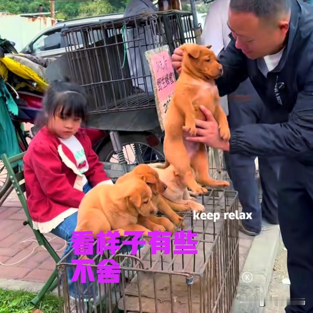 农村的集市上,一个小女孩乖乖地坐在椅子上,她的面前放着一个铁笼,铁笼上趴着几只小狗。小女孩只有四五岁的样子,小狗都是她家的,因为家里养不了那么多,才拿到市场上来卖的! 一名男子看上了女孩家的小狗,走过来问她怎么卖的。小女孩告诉男子,她家的小狗三百块钱一只。男子相中了一只小狗,抓起来看了又看,问小女孩可不可以送他一只? 小女孩低着头,看起来十分为难,让男子去问她的爸爸。男子看着小女孩为难的样子,告诉她只是开个玩笑而已。确认了价格之后,男子带着相中的小狗离开了,只留下小女孩不舍的眼神! 对于一个几岁的小女孩来说,每只小狗都是她的最爱,从女孩的眼神可以看出她也很不舍。但是小女孩明白,小狗们长大了就要去新家,有些分别是在所难免的。小女孩只希望她的小狗,都能找到一个善良的主人,快快乐乐长大吧!