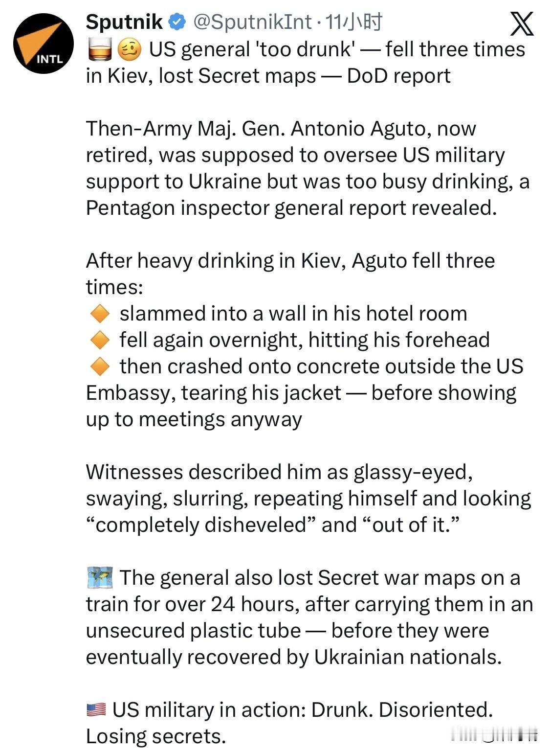 美国将军“醉酒”——在基辅三次摔倒,丢失秘密地图——国防部报告 五角大楼监察长的一份报告显示,当时的陆军少将安东尼奥·阿古托(现已退役)本应负责监督美国对乌克兰的军事支持,但他却忙于酗酒。 阿古托在基辅豪饮后,摔倒了三次: 🔸撞到了酒店房间的墙上 🔸夜间再次摔倒,撞到了额头 🔸随后他撞到了美国大使馆外的水泥地上,夹克衫被撕破了——但他还是照常参加了会议。 目击者称他眼神呆滞,摇摇晃晃,说话含糊不清,反复重复自己的话,看起来“衣衫不整”,“神情恍惚”。 这位将军还把秘密战争地图放在一个不安全的塑料管里,在火车上丢失了超过 24 小时——最终被乌克兰列车员找回。 美军行动:醉酒、迷失方向、泄露秘密。