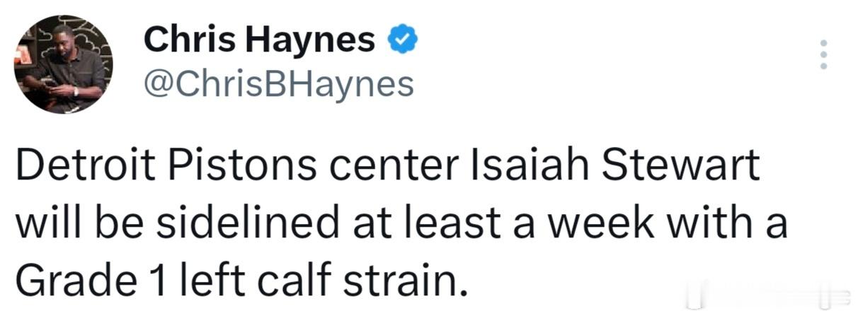 Chris Haynes:活塞中锋以赛亚·斯图尔特因左小腿一级拉伤,将至少缺席一