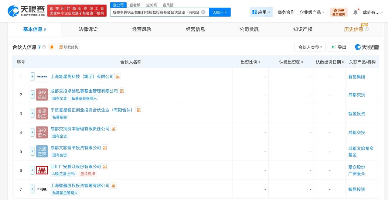 复星集团等在成都成立智能科技基金 出资额2亿 天眼查工商信息显示,近日,成都卓越锐正智能科技股权投资基金合伙企业(有限合伙)成立,执行事务合伙人为成都交投卓越私募基金管理有限公司,出资额2亿人民币,经营范围为以私募基金从事股权投资、投资管理、资产管理等活动。合伙人信息显示,该基金由成都交投卓越私募基金管理有限公司、上海复星高科技(集团)有限公司、宁波复星锐正创业投资合伙企业(有限合伙)等共同出资。 天眼查信息: