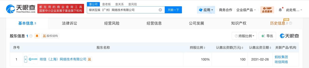 蚂蚁集团在广州成立网络技术公司 注册资本100万 天眼查工商信息显示,近日,绿洲互娱(广州)网络技术有限公司成立,法定代表人为戴鹏超,注册资本100万人民币,经营范围包括信息咨询服务、信息系统集成服务、企业管理咨询、社会经济咨询服务等。股东信息显示,该公司由蚂蚁集团旗下吱信(上海)网络技术有限公司全资持股。 天眼查信息: