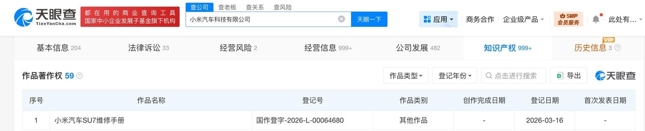 小米汽车登记SU7维修手册著作权 天眼查知识产权信息显示,近日,小米汽车科技有限公司登记“小米汽车SU7维修手册”作品著作权。值得一提的是,此前,该公司还登记了“小米汽车YU7用户手册”作品著作权。 小米汽车科技有限公司成立于2021年11月,法定代表人为雷军,注册资本10亿人民币,经营范围包括新能源车整车制造、汽车整车及零部件的技术研发、智能车载设备制造等。股东信息显示,该公司由小米科技有限责任公司全资持股。 天眼查信息: