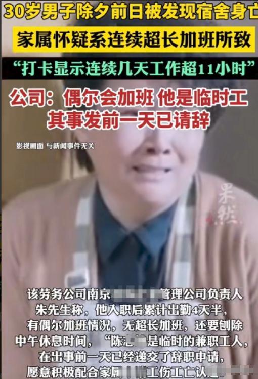 江苏南京,30岁男子陈某外出打工,竟在宿舍突然没了气息。家属翻他手机才发现,他连续四天工作都超11小时,怀疑是加班累倒致死,找公司要赔偿。可公司却百般推诿,先说只赔2万,又改口说他是临聘人员,事发前一天已请辞。网友直呼:这说辞也太巧了! 江苏南京,30岁的陈某,来自农村,性格老实憨厚,为人勤快能干。为了给家里减轻负担,也为了能多攒点钱,他告别家人,独自来到南京打工,找了一份货物分拣类的工作,虽然辛苦,但他从不抱怨,总想着多干一点,多挣一点,早点让家人过上好日子。 事发当天,室友们像往常一样上班,出门前还喊了陈某,可陈某没有应声,室友以为他太累了,想多睡一会儿,就没有过多打扰,各自匆匆出门。 等到晚上下班回到宿舍,室友们发现陈某依旧躺在床上,一动不动,喊他也没有回应,伸手一摸,身体已经冰凉,气息全无。 室友们吓得魂飞魄散,赶紧拨打了120和110,急救人员赶到后,经过检查,确认陈某已经死亡,警方到场后,排除了刑事案件的可能,初步判断为突发疾病身亡。随后,民警联系了陈某的家属,告知了这一噩耗。 接到电话的那一刻,陈某的家属彻底崩溃了,尤其是他的父母,白发人送黑发人,那种锥心刺骨的疼痛,让人难以承受。他们连夜赶往南京,见到陈某冰冷的遗体时,哭得肝肠寸断,无论怎么呼喊,都再也得不到回应。 悲痛之余,家属们想弄清楚,陈某好端端的,怎么会突然猝死。他们翻遍了陈某的手机,在相册里找到了他的打卡照片和工作记录,这一看,所有人都倒吸一口凉气。 陈某去世前的四天,每天的工作时长都超过了11小时,最长的一天,从早上7点多上班,一直忙到晚上7点多,中间只有短暂的休息时间,高强度的加班,几乎耗尽了他所有的精力。 结合陈某平时总说自己头晕、乏力的情况,家属们坚定地认为,陈某的猝死,和连续高强度加班脱不了干系,是长期劳累导致的,于是,他们带着悲痛,找到了陈某所在的公司,希望公司能给出合理的解释,并承担相应的赔偿责任。 可让家属们没想到的是,公司的态度极其冷漠,不仅没有丝毫歉意,反而百般推诿,试图逃避责任。一开始,公司相关负责人表示,陈某的死和公司无关,出于人道主义,只愿意赔偿2万元,打发家属了事。 2万元,对于一条年轻的生命来说,太过廉价,家属们自然无法接受,当场拒绝了这一赔偿方案,要求公司承担起应有的责任,给出合理的赔偿。 见家属态度坚决,公司又突然变了说辞,声称陈某只是公司的临聘人员,并不是正式员工,而且在事发前一天,就已经提交了辞呈,事发时,他已经和公司解除了雇佣关系,公司没有任何责任,也不会再支付任何赔偿。 这样前后矛盾、漏洞百出的说辞,彻底激怒了陈某的家属,也让得知此事的网友们怒火中烧。家属表示,陈某从未跟家里提起过辞职的事情,而且如果真的提交了辞呈,公司为何拿不出相关的书面证明,分明是为了推卸责任,编造谎言。 陈某入职后,公司并未与其签订正式的劳动合同,也没有为其缴纳相关社保,平时的考勤记录,也大多是口头登记,没有完整的书面档案,这也给家属维权带来了不小的困难。 目前,家属已经收集了陈某的打卡记录、工作聊天记录等相关证据,准备通过法律途径,为陈某讨回公道。 此事被家属的亲戚分享到网上后,迅速引发了全网热议,播放量一路飙升。网友们看后,纷纷为陈某抱不平,斥责公司的冷漠和推卸责任的行为,直呼“这说辞也太巧了,简直是把人当傻子耍”。 有人表示,30岁正是大好年华,却因为高强度加班失去了生命,实在令人惋惜,公司不仅不反思,还编造谎言推卸责任,太没有良心。 也有人提醒,长期超时加班会严重损害身体健康,甚至引发猝死,希望所有企业都能重视员工的身心健康,不要一味追求利益,忽视员工的权益。 目前,此事还在进一步处理中,家属的维权之路依旧艰难,所有人都在期盼,能有一个公平公正的结果,还陈某一个公道,也给家属一个交代。 对此,你们有什么看法,欢迎评论留言~