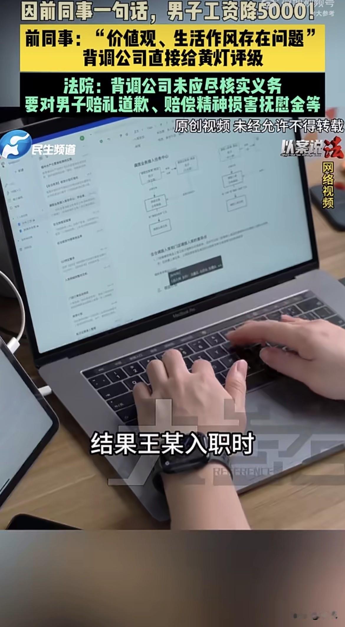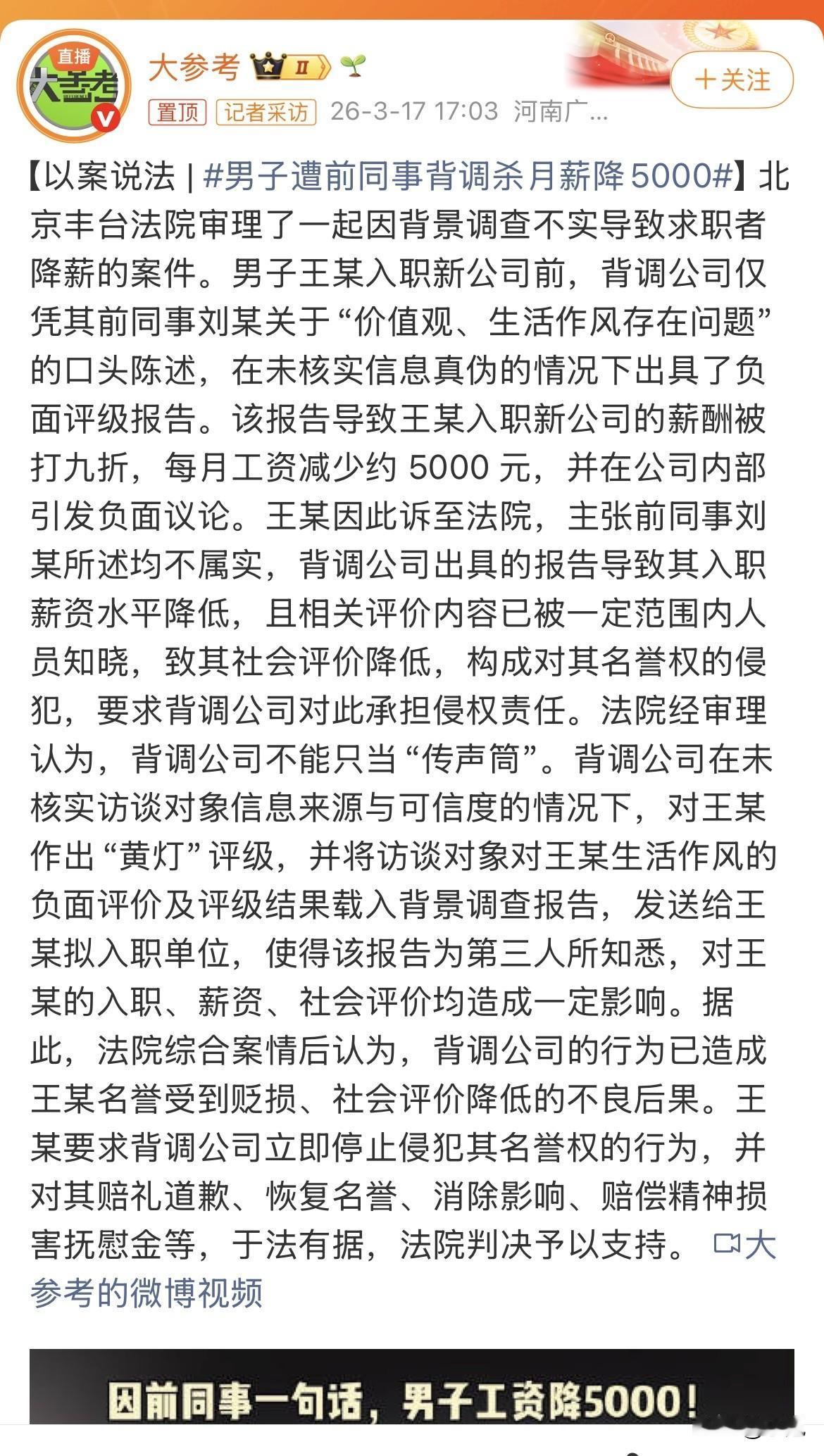 北京一个姓王的男人,跳槽找了份新工作,本来挺高兴的事。新公司对他挺满意,offer都发了,就差走个过场做个背景调查。王某心里没鬼,也签了授权书。 结果谁能想到,就是这个过场,差点把他饭碗给砸了。背调公司的人联系上他前同事刘某,电话里随便聊了聊。也不知道这个刘某跟王某有什么过节,张嘴就来了一句:"这个人啊,价值观有问题,生活作风也不太好。" 就这么一句话,没头没尾,没凭没据。背调公司的人听完,直接记在小本本上,扭头就写进了给新公司的报告里。报告上白纸黑字,还给王某打了个"黄灯",意思是这人有点风险。 王某入职那天才知道,到手的工资比当初谈好的少了差不多5000块,一个月啊。人事那边支支吾吾,后来他才搞清楚,就是因为那份背调报告,公司觉得他有"风险",薪酬直接打了九折。 这还不算完。公司里开始有人对他指指点点,那些关于他"生活作风"的闲话,也不知道怎么就传开了。人还没到公司,名声先臭了一半。 庭审的时候,王某的同事出来作证,说当时公司内部对这事议论特别多,大家都觉得这人还没来就一身骚。王某气得直接把背调公司告了,说他们瞎写,坏他名声。 背调公司在法庭上还觉得自己特委屈,喊冤说他们就是如实记录受访者的话,行业规矩就是这样,只管记,不管查。再说王某最后不也入职了吗?又没丢工作,凭啥赔钱? 这话听起来好像有点道理,但经不起琢磨。 背调公司到底是干什么吃的?拿人钱财,替人消灾,他们的活就是把关。把的是什么关?是把那些胡言乱语、泼脏水的关。如果谁都能随口编排前同事,背调公司原封不动照单全收,那还要他们干什么?直接让新公司建个群,把前同事拉进来随便聊不就得了。 法官最后把这事掰扯得清清楚楚。判决书上写得明白,背调公司不能只当个"传声筒"。像这种关系到人家名声、品德的坏话,你问到了就得去核实真假,不能听风就是雨。随随便便就给人家打"黄灯",写进报告到处传,害得人家工资降了,名声也坏了,这必须得赔礼道歉,还得赔钱。 这个案子最有意思的地方,不是那个瞎说话的前同事刘某,而是背调公司的操作逻辑。 他们收钱办事,本意是想帮企业降低用人风险,结果自己成了风险的放大器。一个背调公司,连最基本的信息核实都不做,就敢在报告里给人贴标签,这比前同事的恶意更可怕。前同事使坏是个别人的问题,背调公司不作为,是整个行业的窟窿。 那些背调报告里的"黄灯"、"红灯",对打工人来说就是生死牌。亮了黄灯,工资打折;亮了红灯,工作泡汤。可这些灯,有多少是经过核实的?有多少是靠谱的? 更让人后背发凉的是,这种事儿不是个例。 有人查了一下,市面上有些背调公司,连求职者的性格特征、抗压能力都敢调查,甚至宣称能核查护照真实性。还有的公司,能查到"不公开但实际留存"的案件信息——说白了,就是走灰色渠道搞隐私。 更有甚者,网上还有人专门做"背调辅导"生意,教你怎么填资料能绕过背调,怎么把证明人都换成自己人,怎么"隐藏"诉讼记录。一次咨询四五百,陪跑到入职将近一千块。 这就荒诞了。一边是正规背调公司连前同事一句闲话都不核实,直接让人工资少五千;另一边是黑产的人帮你造假、洗白,让你顺利入职。背调到底是在筛人,还是在制造新的不公平? 王某这官司是赢了,法院判背调公司赔礼道歉、赔钱。可那些传出去的闲话,收得回来吗?同事之间的议论,止得住吗?一个月少拿5000块钱,能补回来吗? 更深一层想,这事儿暴露的是整个背调行业的标准缺失。 什么叫"与劳动合同直接相关"?法律说得笼统,实际操作中就成了背调公司自己说了算。今天能查"生活作风",明天是不是能查婚恋状况?后天是不是连人家家里几口人、住哪儿、开什么车都得扒一遍? 背调本来是职场诚信的"守门员",现在倒好,成了某些人泄私愤的工具,成了某些公司捞外快的买卖,成了黑产分子赚钱的门道。 现在这年头,跳槽换个工作,背后不知道有多少张嘴在等着。你要是碰上这种事,是认栽还是跟王某一样,死磕到底? 来源:大参考