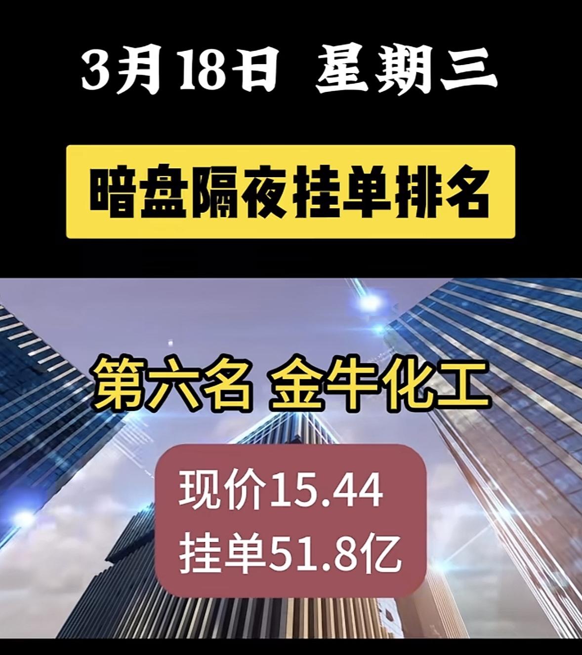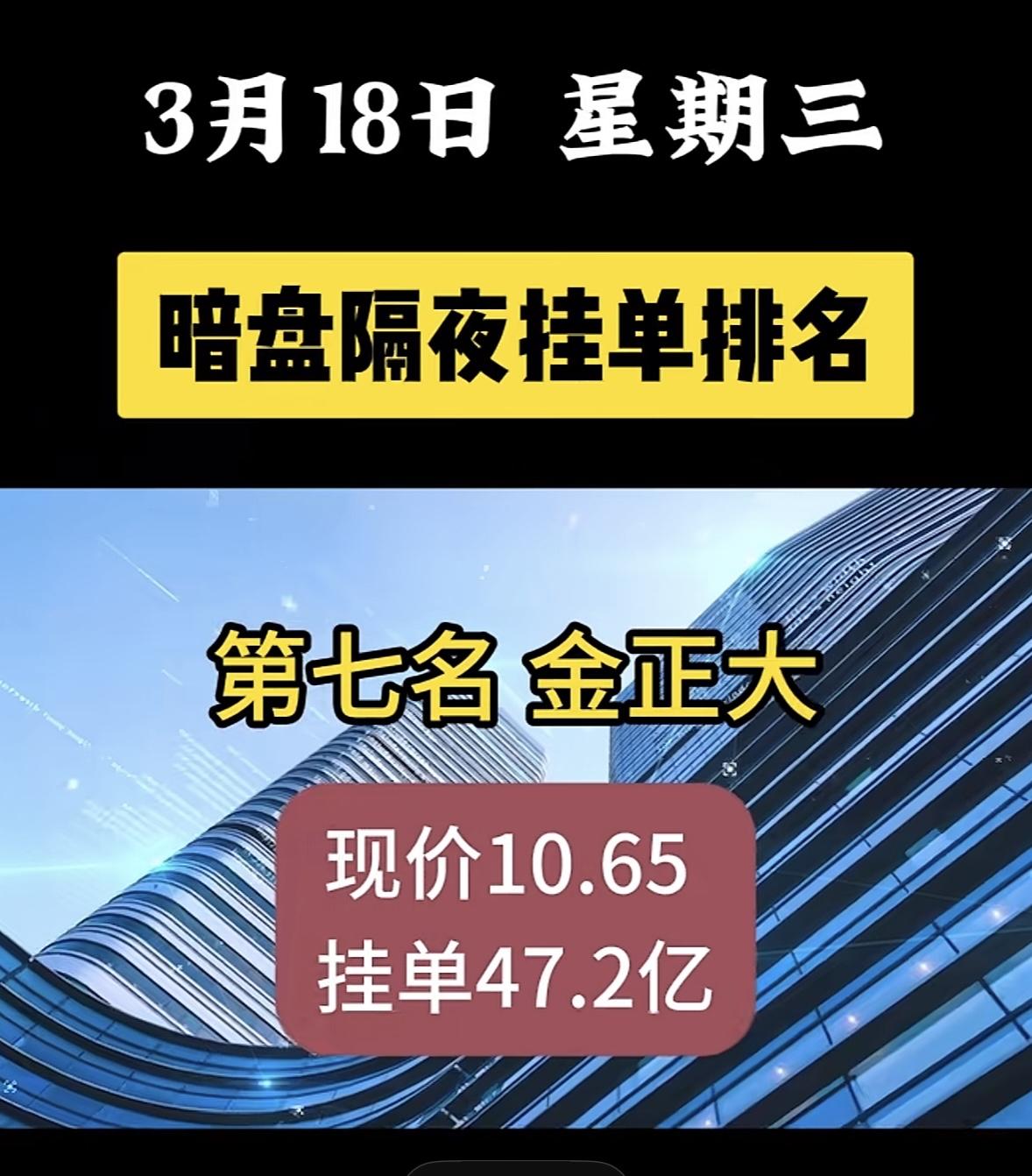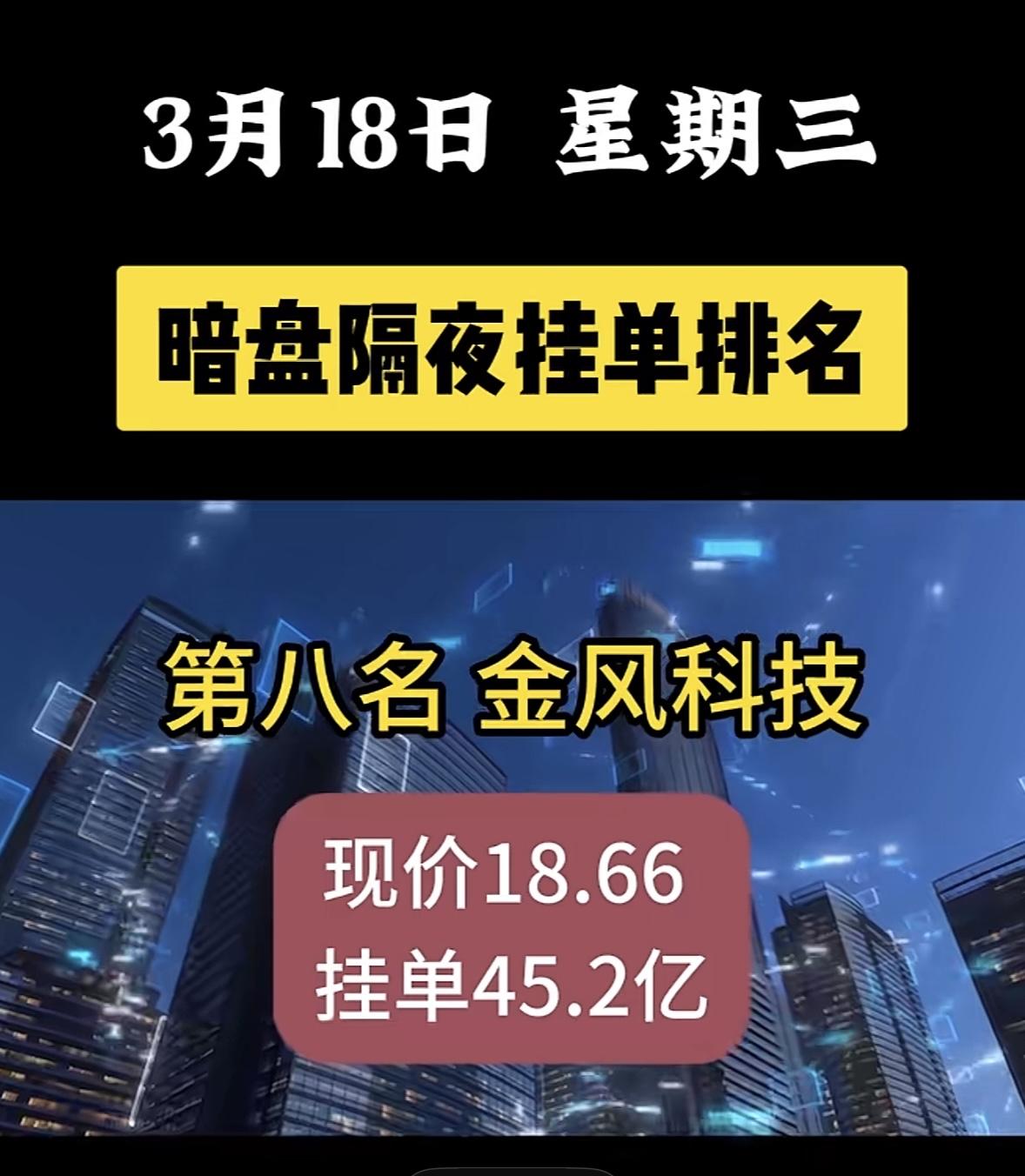 3月18日周三暗盘隔夜挂单排行榜揭晓 金风科技这暗盘隔夜挂单排名第八的消息一出