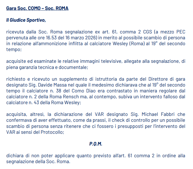 “体育法官收到罗马俱乐部依据《体育司法法典》第61条第2款提交的申诉(通过PEC邮件,于2026年3月16日16:53送达),内容为‘针对韦斯利的黄牌是否涉及认错人的情况’,在递交申诉时一并提交了相关电视画面,同时也收到了当值主裁判马萨提交的补充说明。”
