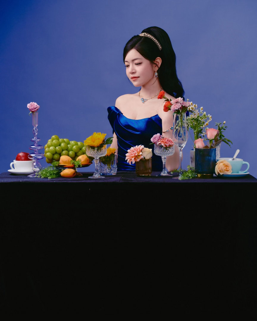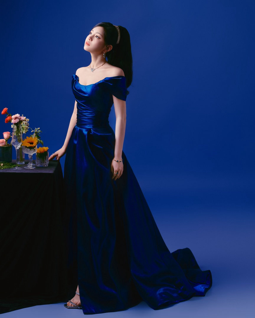 这是从油画里走出来的复古千金吧!藏青色缎面长裙衬得肤色如雪,高开衩设计若隐若现大长腿,发带轻挽半扎发,甜而不腻,贵而不傲,刚刚好的优雅。