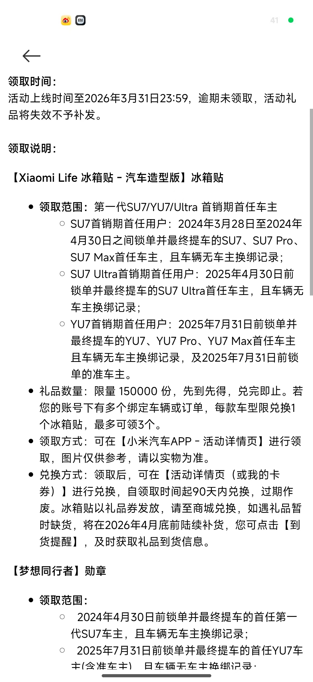 小米向第一代SU7/YU7/Ultra首销期首任车主赠送定制冰箱贴,限量15万份。