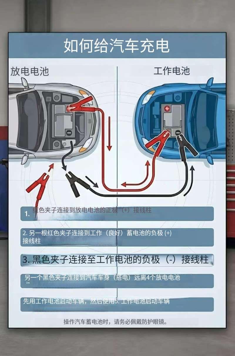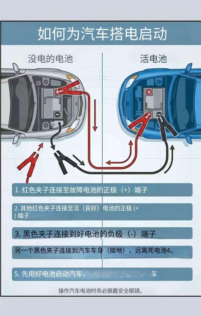 🚗 汽车电瓶亏电怎么搭电?一看就会! 电瓶没电了?别慌!🤷♂️ 把这张图存好,就知道搭电线该夹在哪,不会烧线路。 核心规则就两条: 1️⃣ 红色夹子 —— 夹电瓶正极(+) 2️⃣ 黑色夹子 —— 夹电瓶负极(-),或者夹车身金属部位搭铁 转给那个总忘关车灯的朋友吧!😂👇