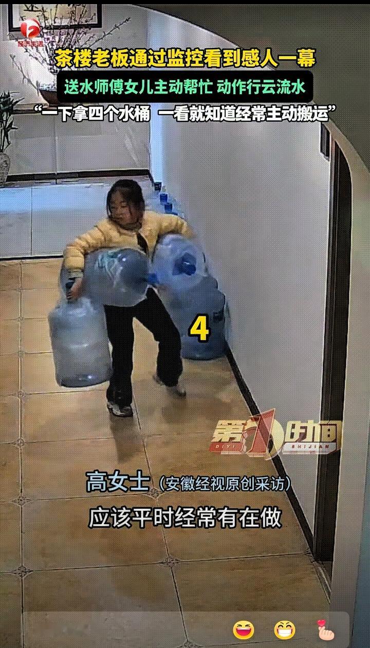 现在竟然还有这样的孩子 安徽的高女士开的茶楼,送水师傅带着8岁的女儿来送水,父亲负责把水扛上楼,女儿跟在后面,安安静静地帮忙搬运空水桶。孩子一次能稳稳地拿四个空桶,动作熟练、节奏自然,没有多余的表情,也没有刻意表现,只是默默把能做的事做好。 据店里的工作人员说,孩子几乎每次都会跟着爸爸过来,周末早上来,平时放学就赶过来,小小年纪就习惯了陪伴父亲一起做事,不偷懒、不抱怨,也不贪玩。 现在很多家庭都把孩子照顾得十分周到,不少孩子从小生活安稳,很少接触体力活,也不太能体会父母工作的辛苦。有的孩子放学之后更愿意玩手机、看电视,家务很少参与,更别说主动跟着父母外出干活。 但这个8岁女孩用最朴素的行动告诉大家,懂事从来不是靠说教,而是发自内心地体谅家人。她没有惊天动地的举动,只是在爸爸辛苦的时候,尽自己小小的一份力。这种不声不响的懂事,比任何夸奖都更打动人。 其实对孩子来说,成绩很重要,快乐成长也很重要,但比这些更长久的,是懂得感恩、愿意分担、踏实做事的品质。一个从小知道心疼父母、愿意承担责任的孩子,未来不管走到哪里,都能让人放心,也更容易收获尊重。 真正的教育,不是把孩子护在温室里,而是让他们在生活里学会理解、学会付出。平凡生活中的这份懂事与担当,才是一个人最珍贵的底色。