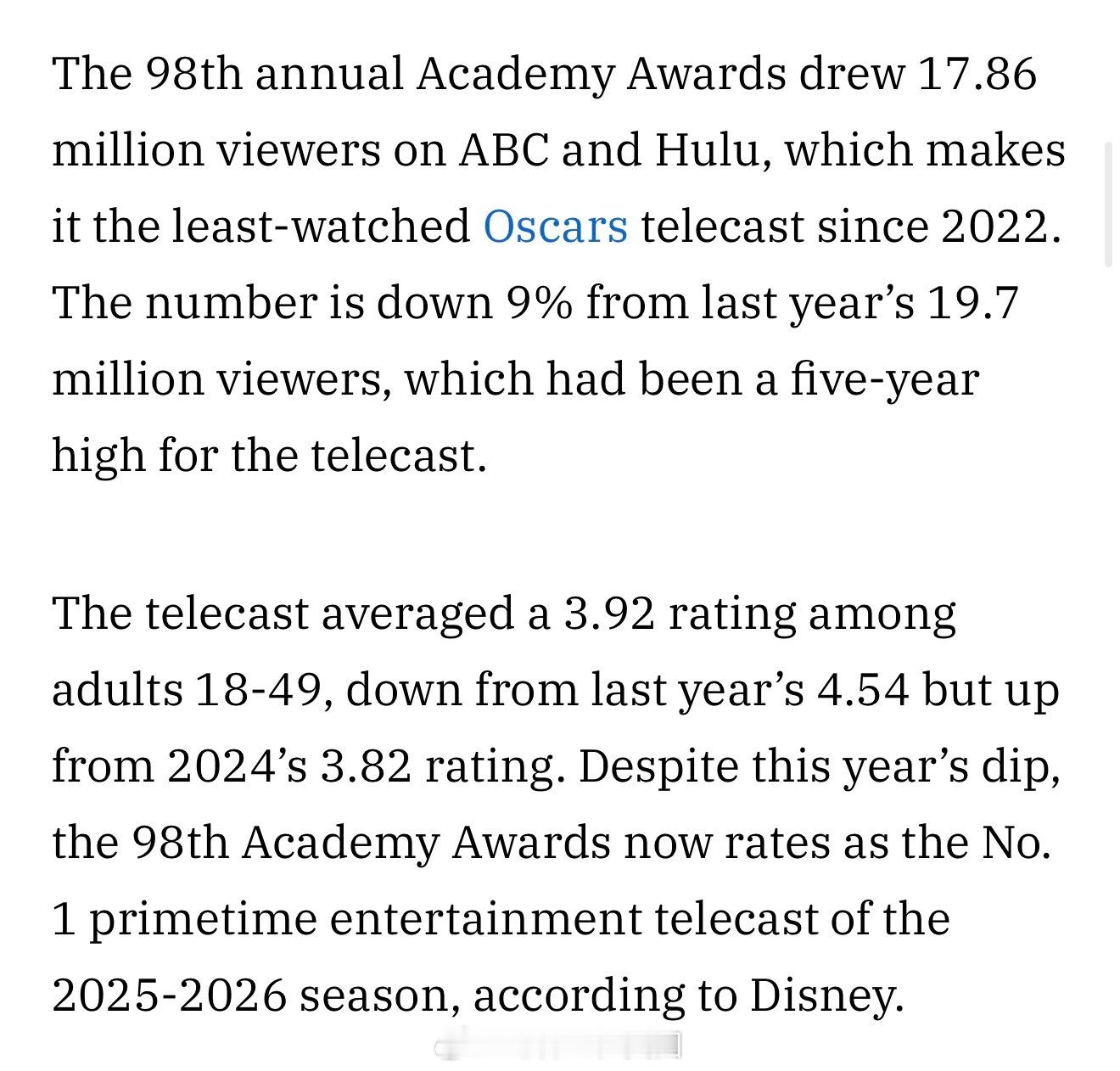今年奥斯卡收视率较去年跌9%,近4年来最低。