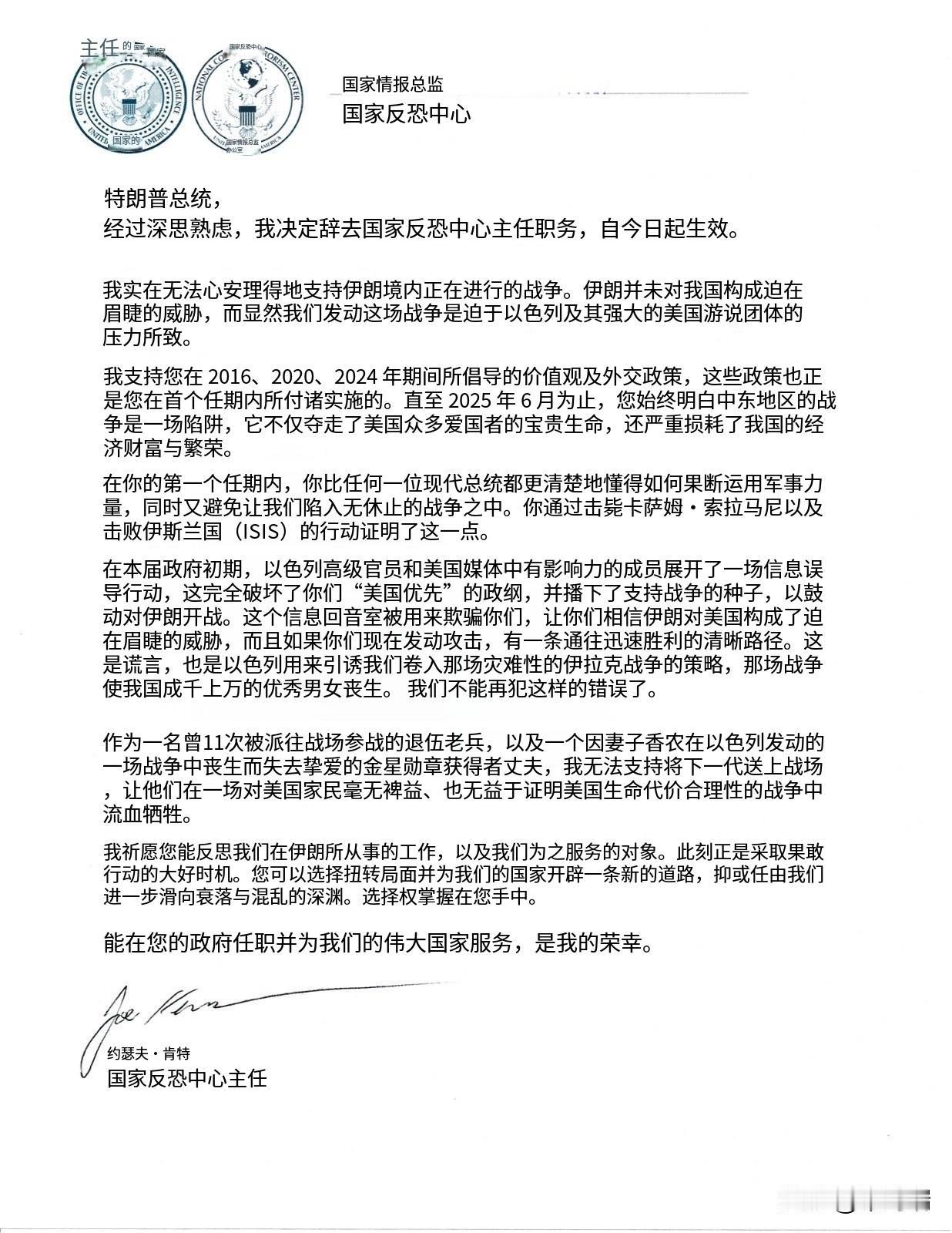 突发:美国国家反恐中心主任乔·肯特(Joe Kent)今天辞职。 辞职信直接递给特朗普,理由只有一个: "伊朗对美国没有构成迫在眉睫的威胁,这场战争是在以色列及其美国游说集团的压力下发动的。" 他是11次出征的特种部队老兵,妻子在他眼中"死于以色列制造的战争"。