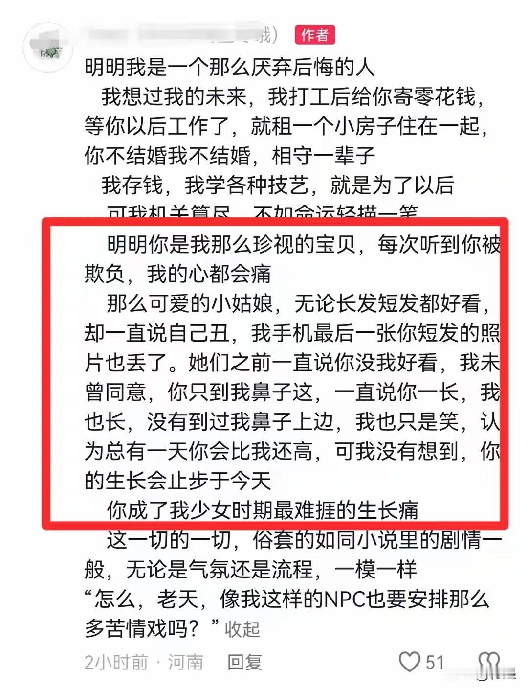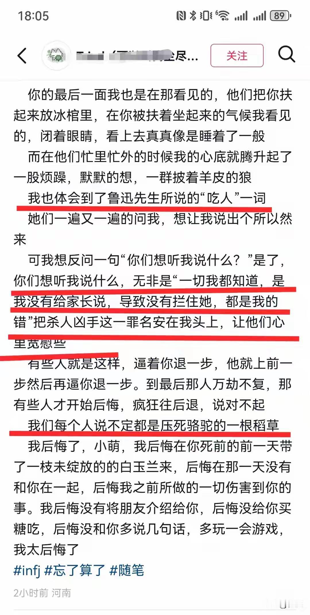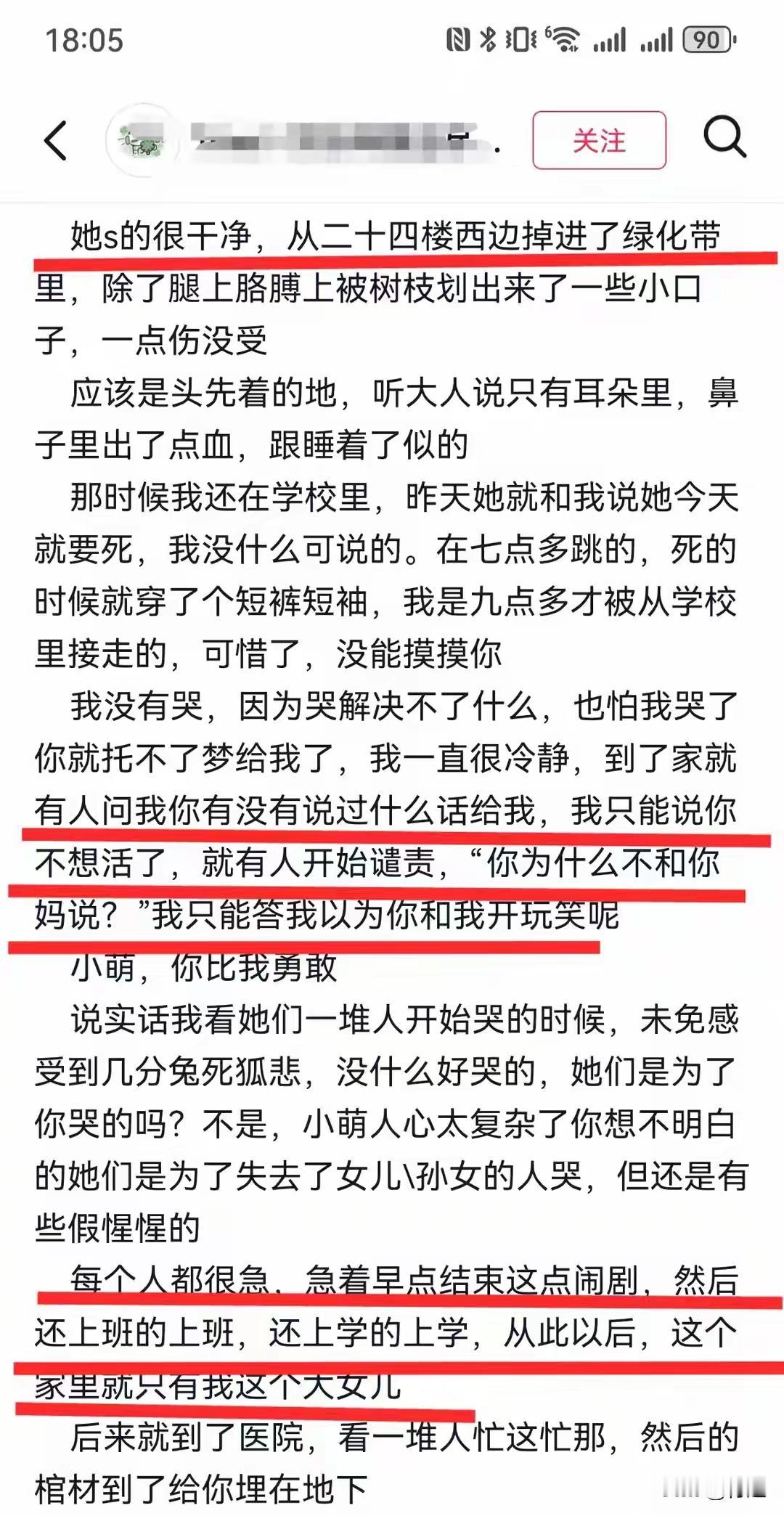 【河南女孩小萌从24楼跳下】 姊妹俩,妹妹小萌患有忧郁症。 妹妹常跟姐姐开玩笑,生死之事。 谁知妹妹再次和姐姐说要离开,姐姐没有告诉父母,以为开玩笑。 这一次是真的,从24楼一跃而下。 姐姐认为这一切都和父母有关系,悲剧发生,难以想象。