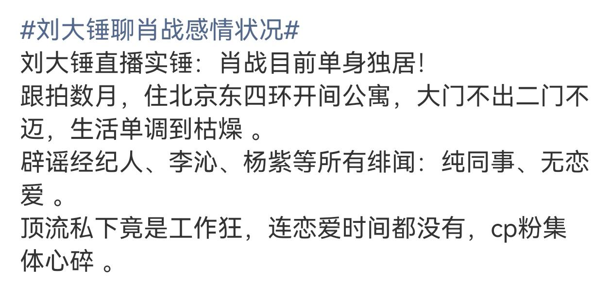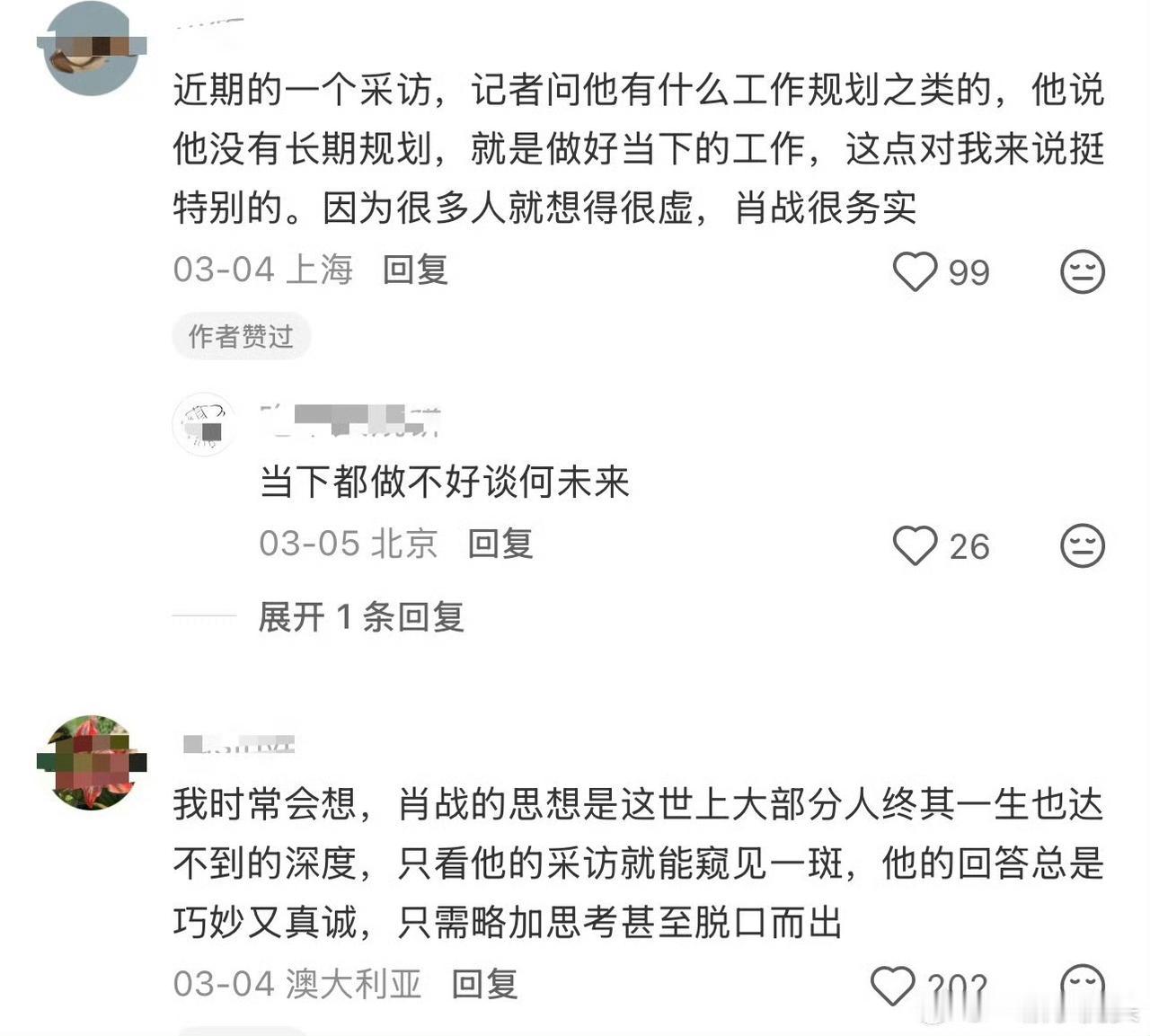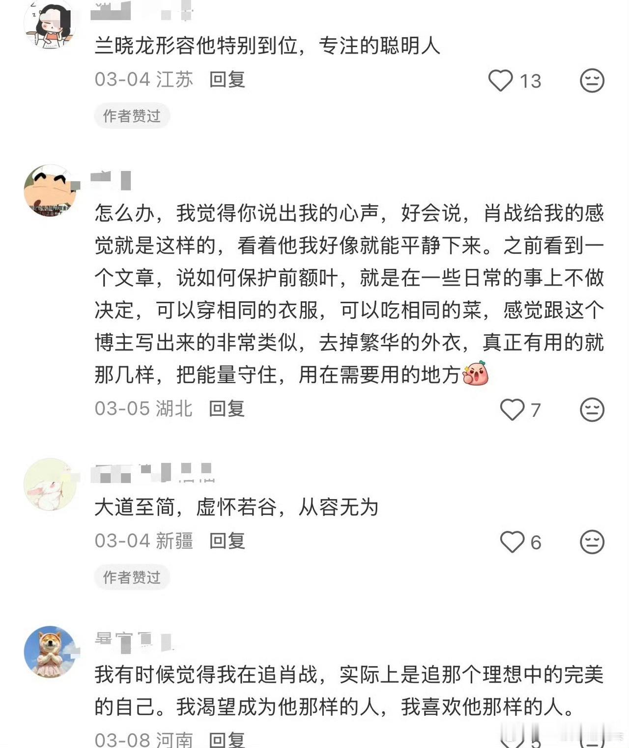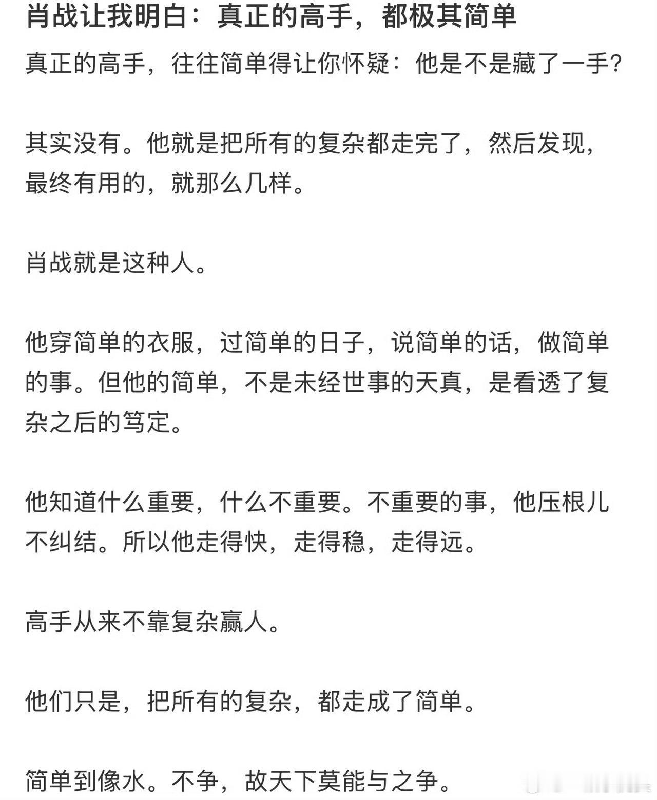 兰晓龙评价肖战时说他是一个专注的聪明人,郑晓龙说肖战在拍戏的期间内整个人都是沉浸在角色里的,没见过他干别的,跟肖战合作过的演员都说他平时在现场就是研究角色,跟导演讨论戏,下戏回去就是健身,等戏期间聊天聊养生和健身[笑哭] 肖战真的是把大道至简实践到极致[赞][赞][赞]