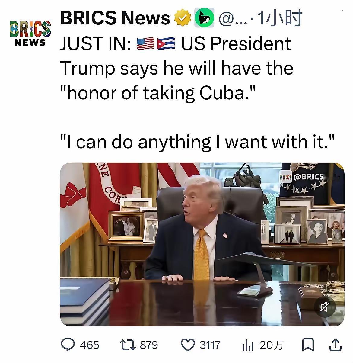 2026年3月16日,特朗普在白宫办公室接受记者采访时发表言论 核心是对古巴的主权威胁:特朗普明确表示,他将以“某种形式”接管古巴,并称这是“巨大的荣誉”,还补充道“无论是解放它,还是接管它,我都可以对它为所欲为”。 他将古巴描述为“非常虚弱的国家”,并指责古巴历史上的领导人“极度暴力”。 有网友评论:看到古巴,委瑞内拉,就想起来清朝,别指望外人解放,他们只会掠夺,还得是自己人解放自己人 特朗普真是恶魔,破坏世界,唯恐天下不乱,这个联合国一点点作为都没有吗?真的应该退群另组联合国了。 对此,你怎么看?