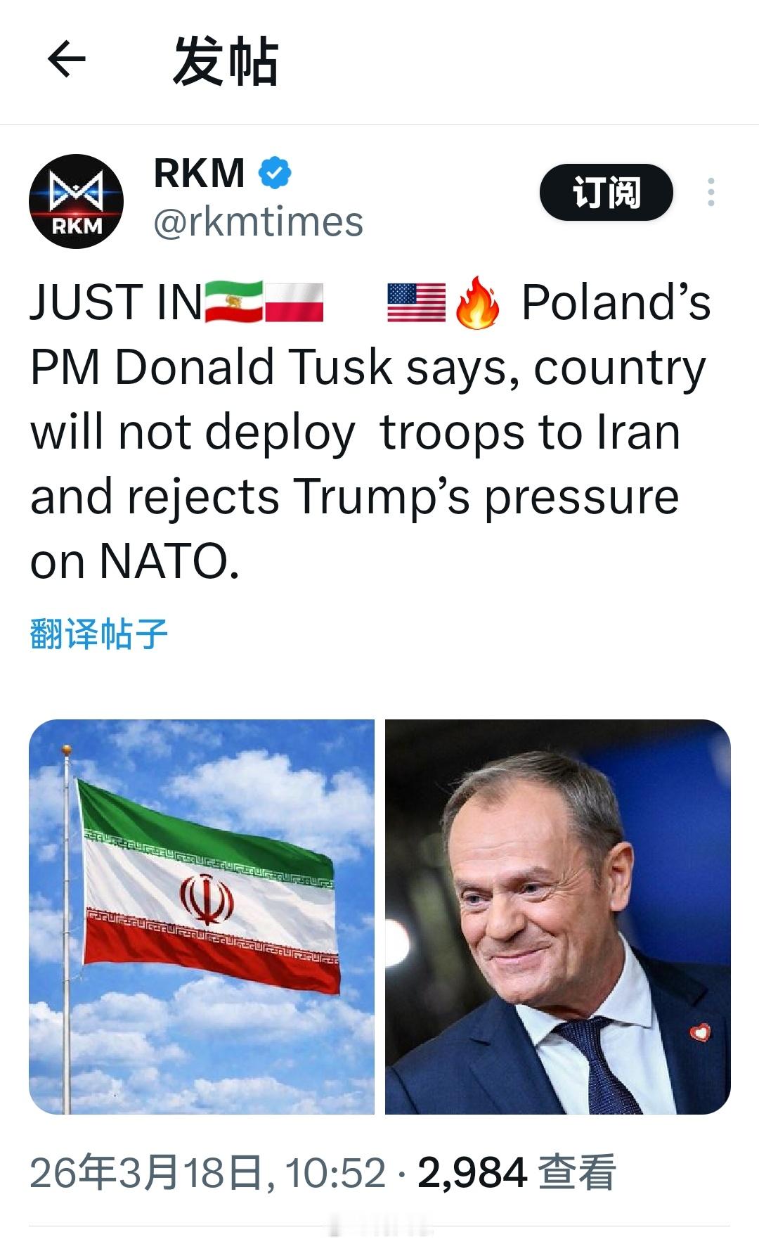最新消息 :波兰总理唐纳德·图斯克表示,波兰不会向伊朗派遣军队,并拒绝了特朗普对