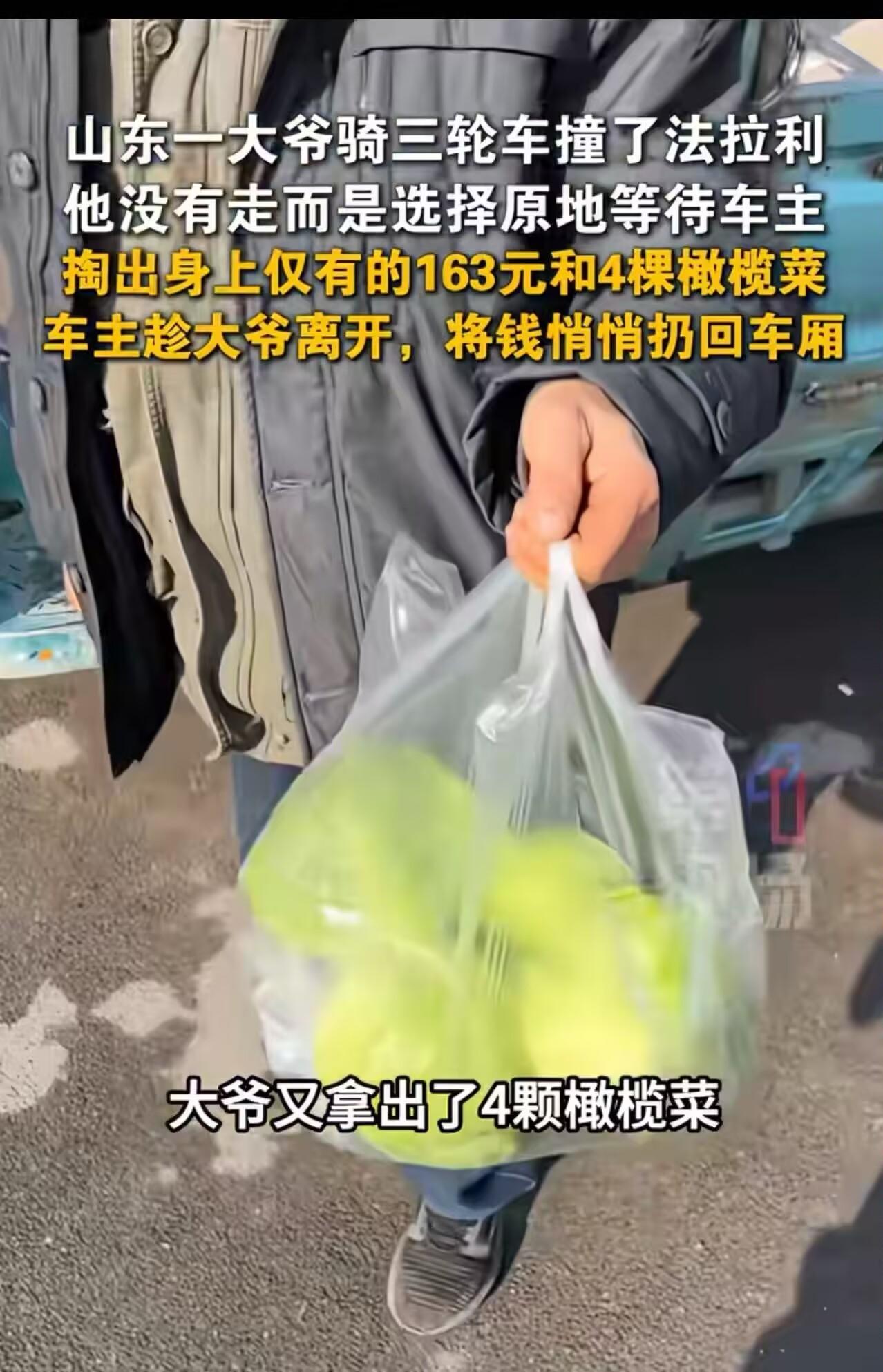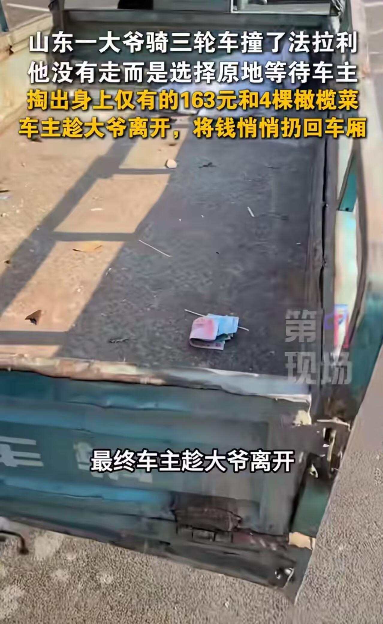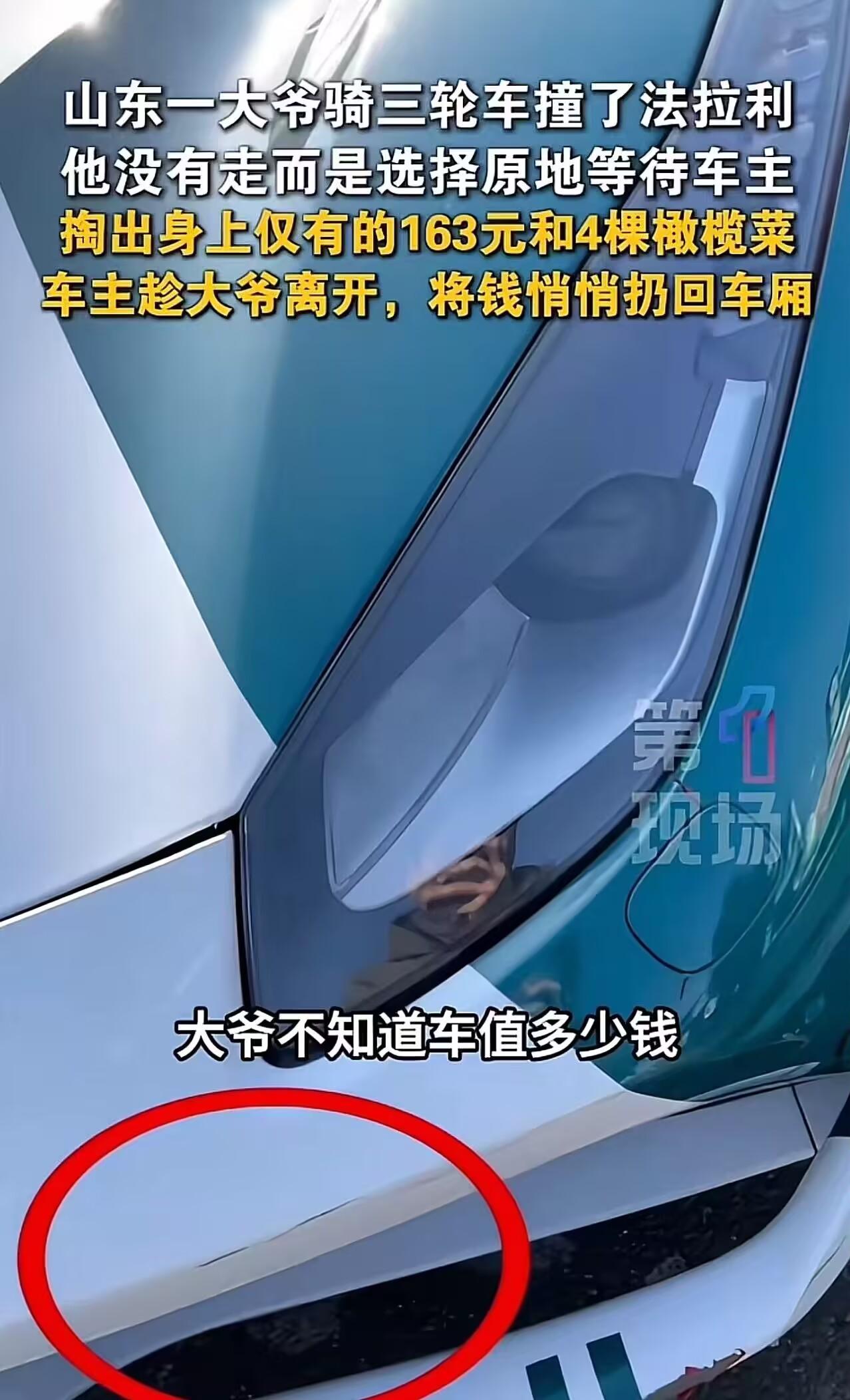 这才是格局!山东,大爷骑三轮车撞了法拉利,他没有跑而是选择原地等待车主。车子价值几百万修车也要几万,可大爷只掏出了身上仅有的163元和4棵橄榄菜来赔偿!车主愣了一下,跟大爷说了车子的价格,大爷惊呆了,随后一幕令人泪目! 山东青岛,一辆价值数百万的法拉利跑车静静停在路边。 突然,“哐”的一声——一辆破旧三轮车撞上了它的前保险杠。 骑三轮的是个七十多岁的农村大爷,凌晨三点就起床进城卖菜。看着眼前被撞的车,他手都在发抖。 但他没跑。 三月的风还带着寒意,大爷就蹲在路边等。过了半个多小时,车主才慢悠悠晃过来。 “是我撞的,俺等着赔你。” 年轻车主俯下身子检查自己的车子,只见前保险杠被撞掉了很大的一块漆面,已经漏出了底层的塑料,需要进行喷漆处理。 车主看到自己的爱车被撞成这样心疼不已。 大爷翻遍全身,掏出所有家当:一把皱巴巴的零钱,最大面额20块,总共163元。 他把钱递过去,浑浊的眼里满是愧疚,嘴里不停的说着:真是对不住了,我不是故意的,我愿意赔偿。 车主愣了一下,说:“大爷,你知道这车得多少钱吗?这车修一下,得多少钱。” 大爷摇摇头,眼神迷茫。 “这车好几百万,修一下得好几万。您这钱……真不够。” 大爷彻底懵了。他呆呆站着,嘴唇哆嗦,半天说不出话。然后他突然想起什么,转身从三轮车上抱下四棵剩下的橄榄菜。 “小伙子,俺……俺就这些了。菜还新鲜,你拿回去吃吧。” 他把菜和钱一起捧到车主面前,像捧着自己全部的诚意。 车主看着眼前这双手——粗糙、开裂、布满老茧。再看着那张被岁月刻满沟壑的脸,眼神里没有狡黠,只有最朴实的歉意。 他忽然明白,这163块钱和四棵橄榄菜,已经是这个老人能拿出的全部。 车主接过钱,又接过菜,郑重地点点头:“行,大爷,钱我收了,菜我也收了。您以后骑车慢点,注意安全,走吧。” 大爷愣住了,眼眶发红,连声道谢,推着车准备离开,背影显得格外佝偻又沉重。 而车主趁着大爷没注意,悄悄把那163块钱塞回了大爷车斗的角落里! 这一幕被路人拍下传到网上,引发了网友热议:有的网友说,“这才是中国爷们儿!” 也有的说,“大爷没跑是良心,车主没要更是格局。” 还有的说,“一个没辜负穷人的善良,一个没辜负富人的体面。” 是啊,这个世界从不缺有钱人,但缺的是懂得尊重别人的人;也从不缺穷人,但缺的是穷得有志气、有底线的人。 163块钱,修不了任何一块车漆。但那四棵橄榄菜,却见证了两个灵魂的平等对话。 善良,从来不是用钱衡量的。它是大爷蹲在路边等车主的两小时,是车主接过菜时那一声轻轻的“好”。 这世上最好的修养,不过就是:你没辜负我的真诚,我没践踏你的尊严。 这才是我们最想看到的中国温度,这才是社会该有的样子! 向这位可敬的大爷致敬,也为这位暖心的车主喝彩!你们,都是这个时代最美的风景!