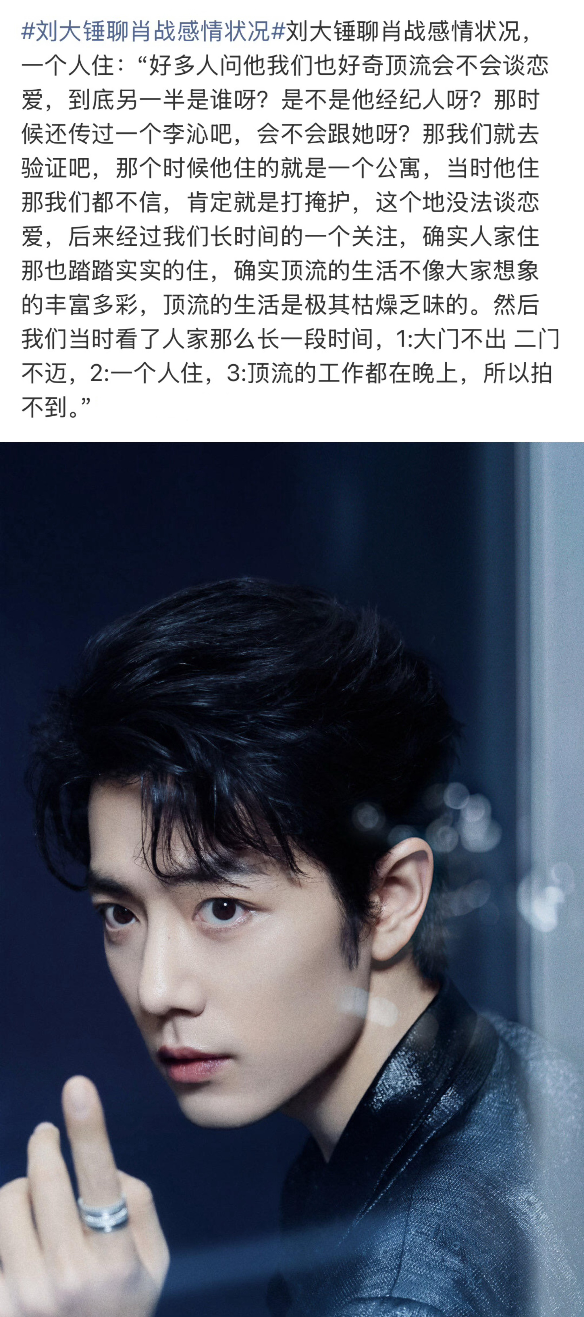 刘大锤聊肖战感情状况确实顶流的生活不像大家想象的丰富多彩,顶流的生活是极其枯燥乏