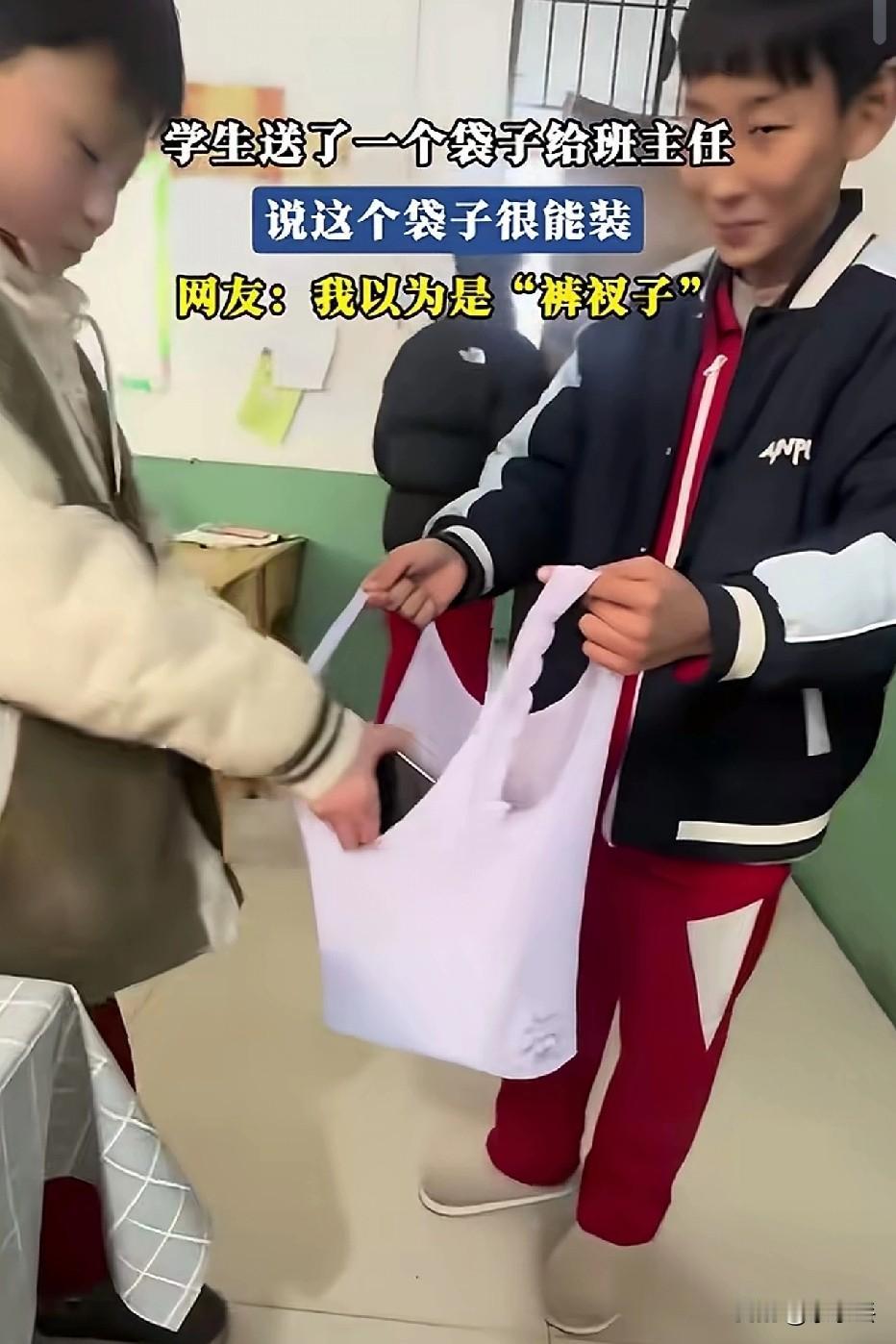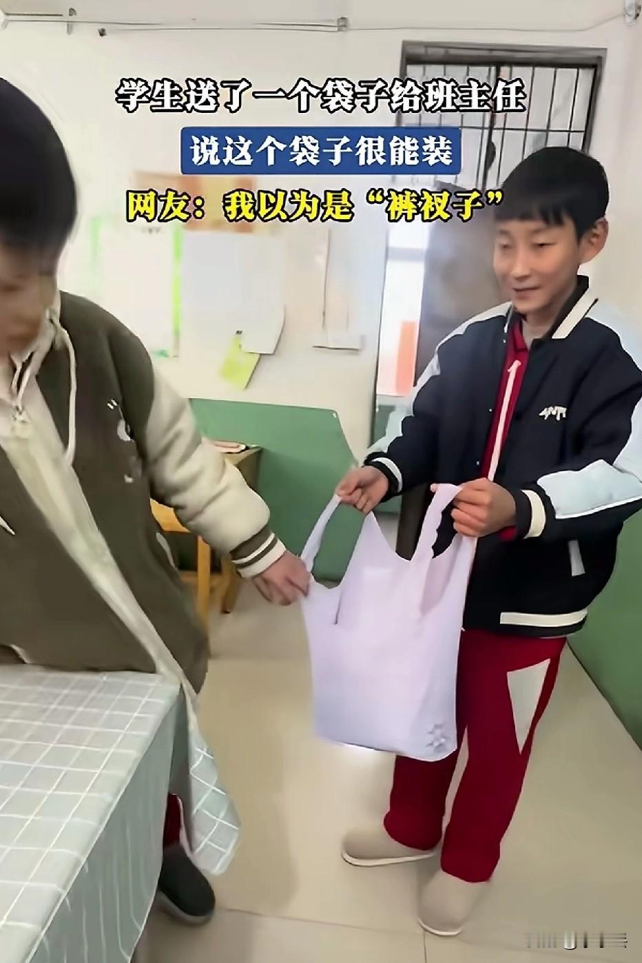 学生送我一个“裤衩子”,打开后我笑出了声 今天上课,一个男生神神秘秘拽住我,说要送我个“很能装”的袋子。 我低头一看,那浅紫色的褶皱、两条细细的提手,乍一看跟个大号裤衩子似的,周围同学都憋不住笑,我也差点绷不住脸。 结果他一拉开,这玩意儿居然能撑成个大布袋,手机、教案、作业本往里一塞,还真挺能装。 后来才知道,这是他跟奶奶学的,用旧布料改的伸缩袋,平时揣兜里跟块布似的,出门买菜、装东西一拉就成包,环保又实用。 我捧着这个“裤衩袋”,心里暖乎乎的。孩子哪懂什么审美,他只知道“老师东西多,这个能装”,把最朴素的关心,缝进了这一块布里。 比起那些精致的礼物,这种带着烟火气的小心思,才最戳人。 你们上学时,收到过学生送的什么“奇葩”礼物?评论区聊聊,让我看看谁的更离谱?
