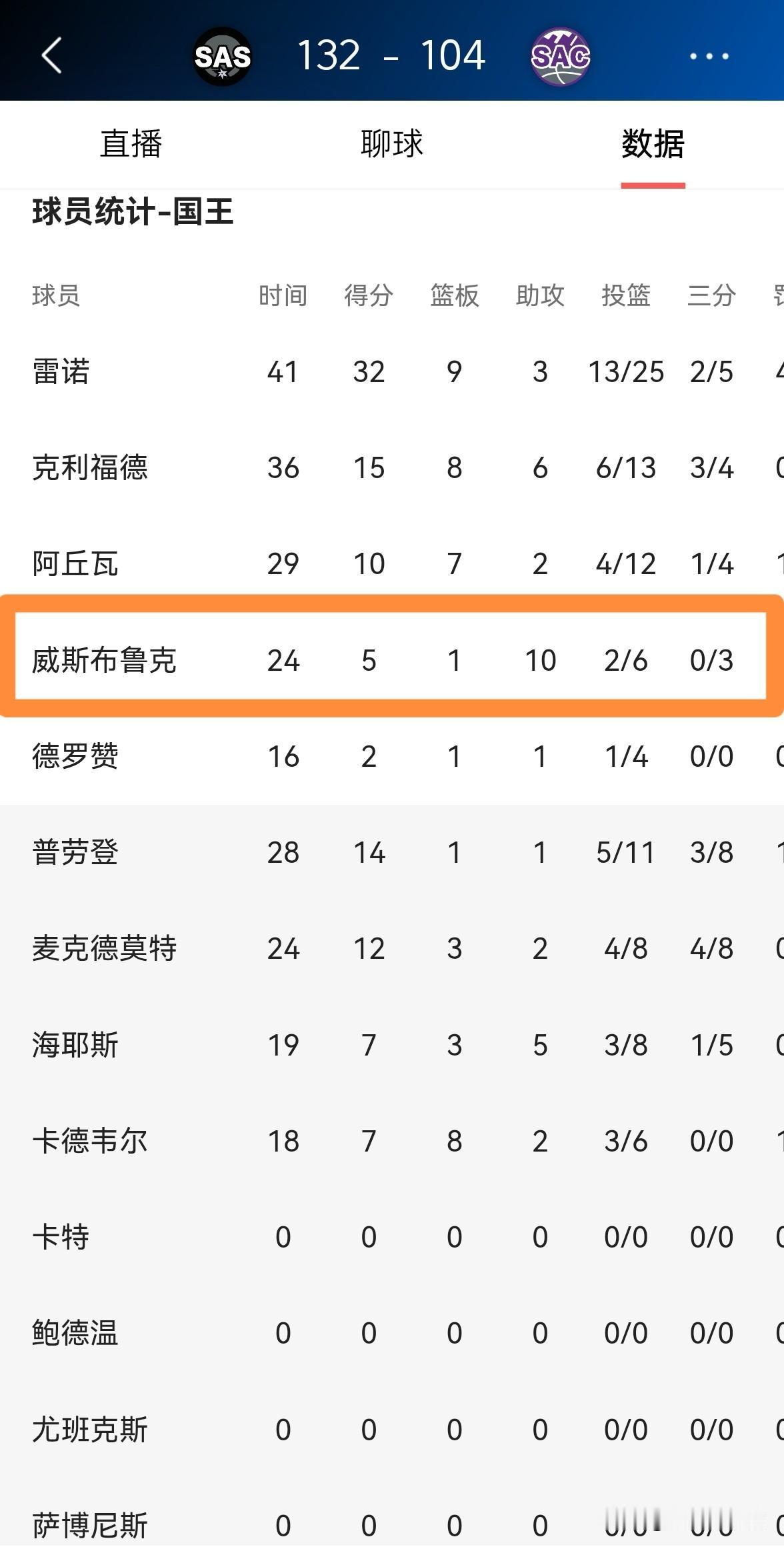 国王老将威斯布鲁克真是痴迷于刷助攻!在今天国王主场以104:132惨败于马刺的比赛中,威少将自己渴望刷助攻的心情展现的淋漓尽致。 全场比赛下来,威少首发出战24分钟,投篮6中2,其中三分球3中0、罚球2中1非常低效的得到5分,不过有10次助攻,他的场上正负值为-27。 值得一提的是,本场比赛过后,威少在NBA历史助攻榜上的排名升至第五,成为了NBA历史上名副其实的五大控卫之一。