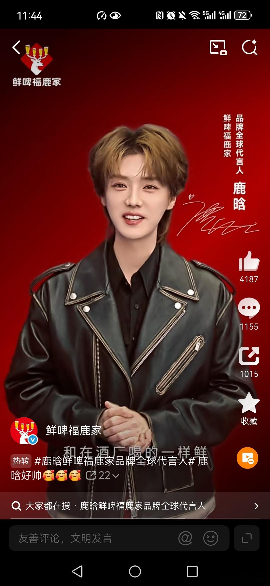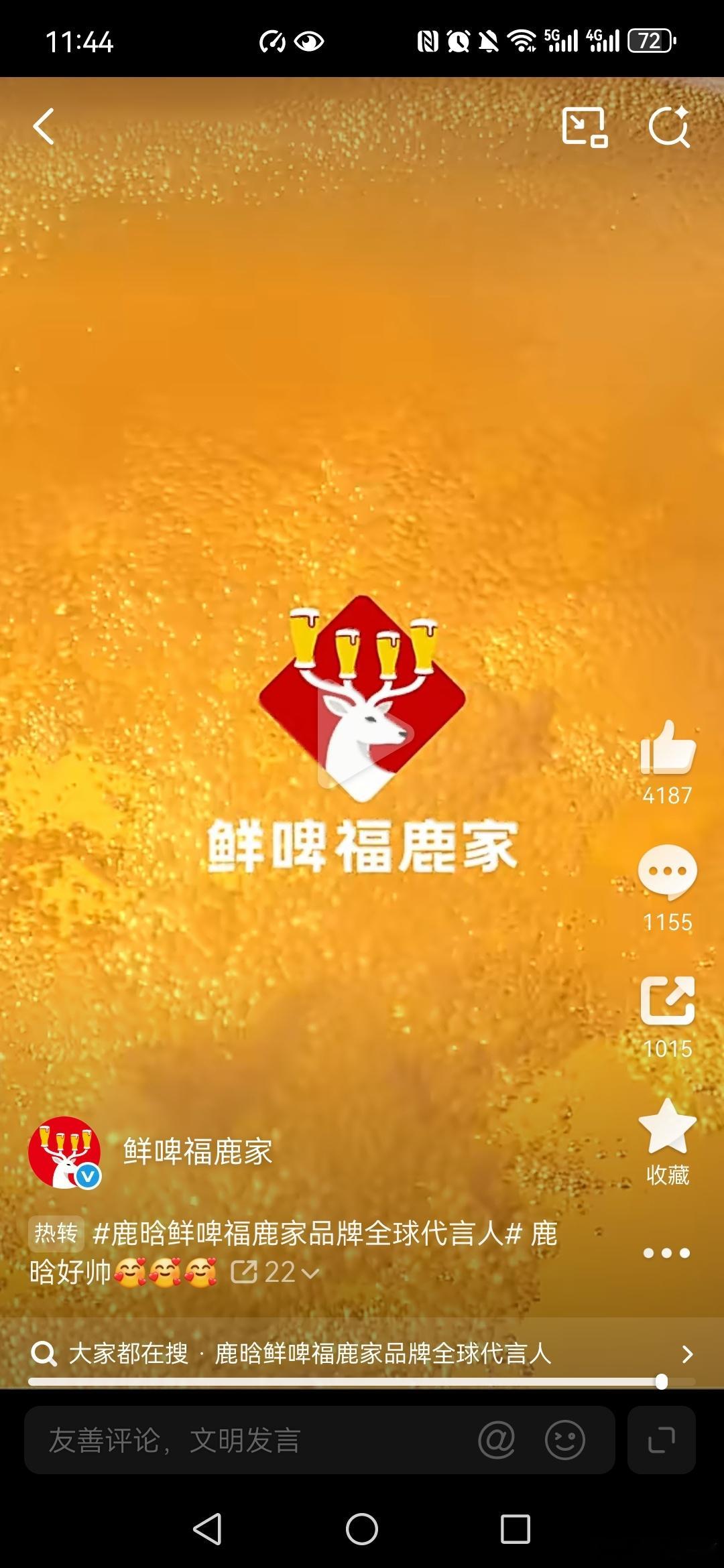 鲜啤福鹿家鹿晗鲜啤福鹿家品牌全球代言人和鹿晗碰杯万事OK 观看了鹿晗的代言视频,鹿晗是顶流明星,帅气有颜值,跟着他一起「喝鲜啤,福鹿家」,我喝过体验后,发现口感酸甜适中、酒体略粘稠,适合日常畅,而且平价,现打现卖、低温锁鲜。推荐给家人们。