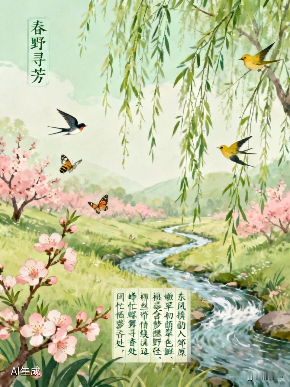春野寻芳 《七律*春野逸情》乐韵诗心原创诗词: 东风携韵入郊原, 嫩草初萌翠色鲜。 桃蕊含情燃野径, 柳丝带梦绕溪边。 蜂忙蝶舞寻香处, 燕语莺啼唤暖天。 我醉春光寻胜趣, 闲抛俗虑卧芳田。