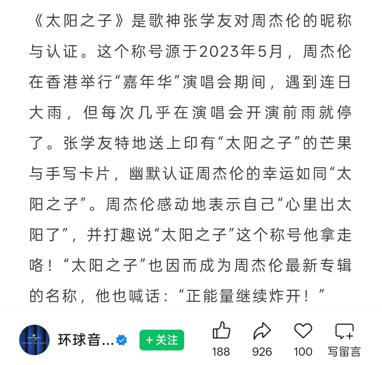 #周杰伦专辑名太阳之子来源##周杰伦专辑名来源#《太阳之子》是歌神张学友对周杰伦的昵称与认证。这个称号源于2023年5月,周杰伦在香港举行“嘉年华”演唱会期间,遇到连日大雨,但每次几乎在演唱会开演前雨就停了。张学友特地送上印有“太阳之子”的芒果与手写卡片,幽默认证周杰伦的幸运如同“太阳之子”。周杰伦感动地表示自己“心里出太阳了”,并打趣说“太阳之子”这个称号他拿走咯!“太阳之子”也因而成为周杰伦最新专辑的名称,他也喊话:“正能量继续炸开!”