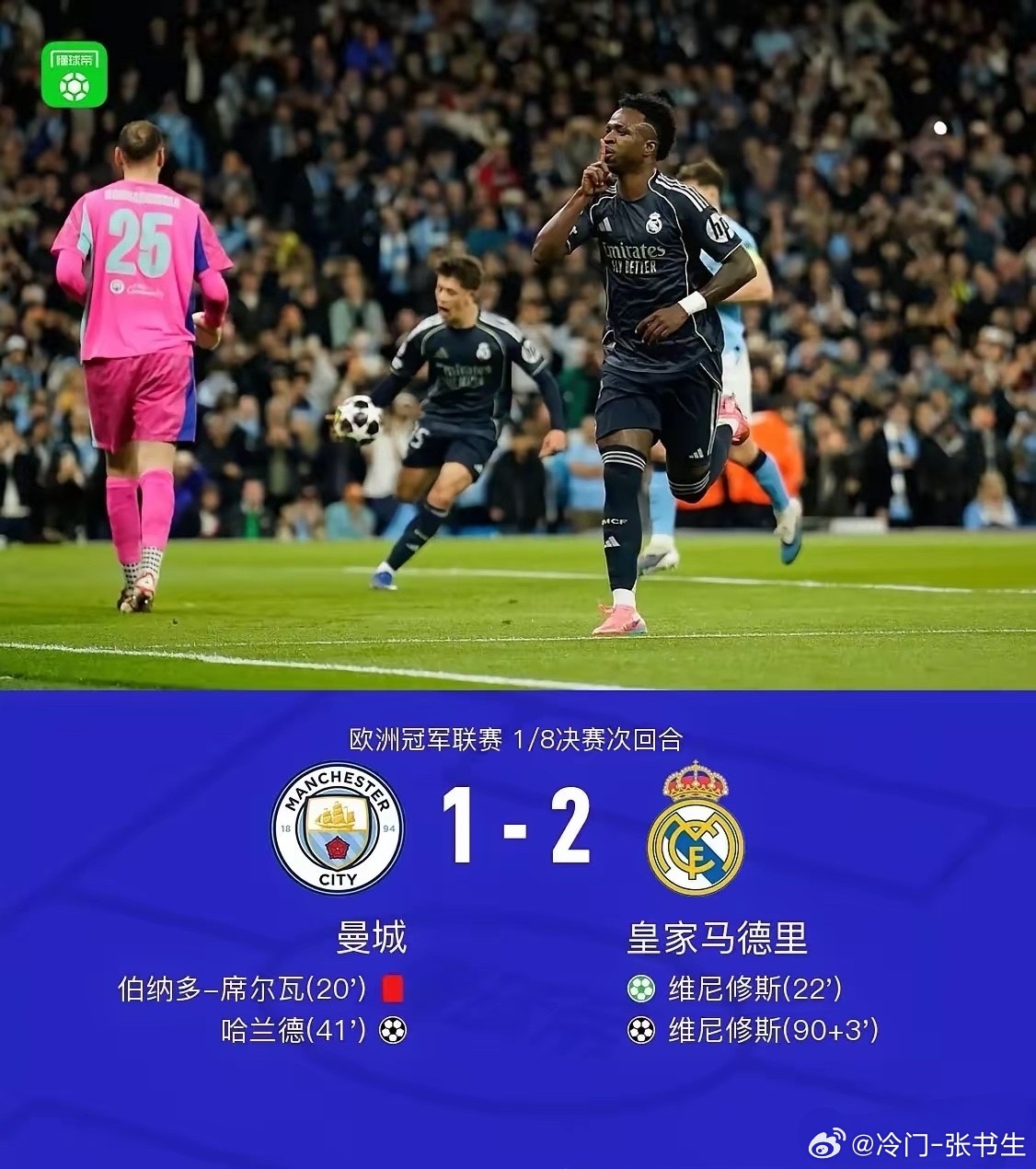 曼城被淘汰,实力有差距,输得不冤!欧冠1/8决赛次回合,曼城1:2不敌皇马,皇马晋级8强。观后感如下:1. 曼城与皇马实力有差距。曼城场面热闹,但创造绝对机会少,面对皇马顽强防守,久攻不下,显得急躁,失误多,终结能力差。皇马则自信从容,传球流畅,反击犀利。维尼休斯一人搅乱曼城后防,曼城输给强者,不冤。2. 维尼休斯功过相抵。他技术超群,速度、跑位、捕捉战机能力无人能及,包揽两粒进球,但也浪费了至少5次绝佳机会。3. 罗德里能力下滑。这位2024年金球得主,本场几乎隐身,组织进攻拖沓,分配球权犹豫,当年风采不再,可惜!足球欧冠联赛曼城1比2皇马曼城无缘欧冠八强皇马