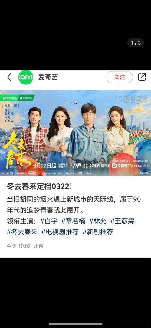 搬运“北风”爱奇艺视频3月到5月排播更新!【3月】3.22《冬去春来》白宇章若